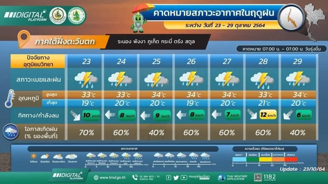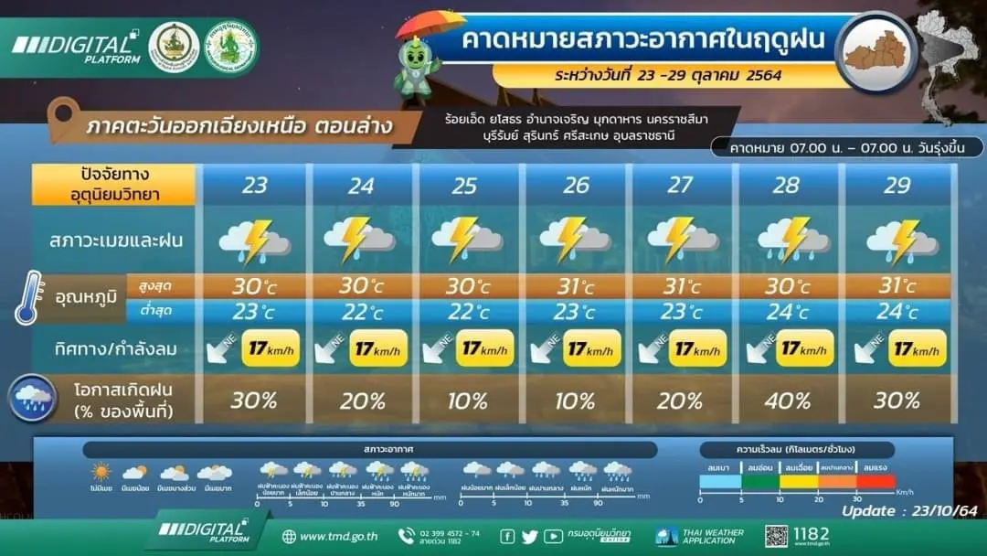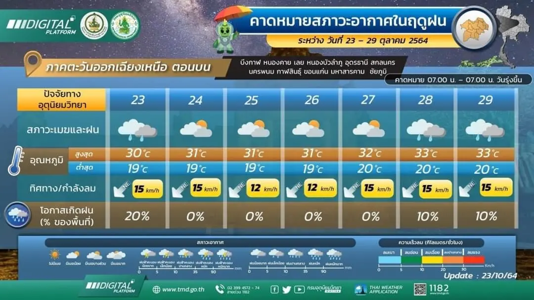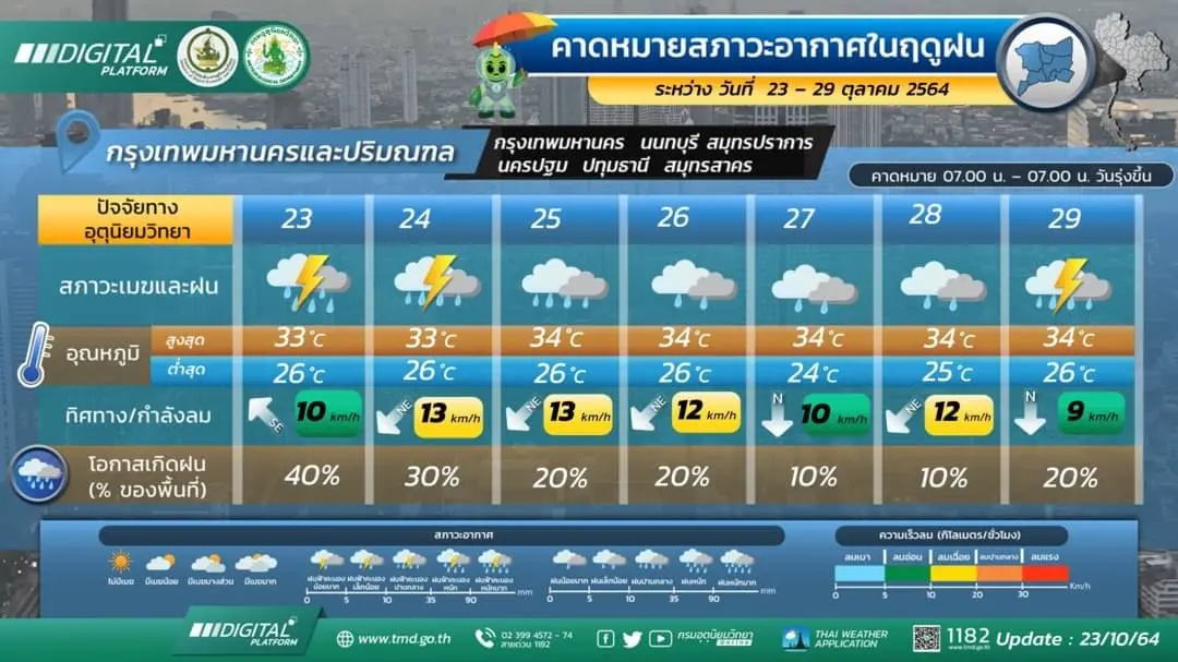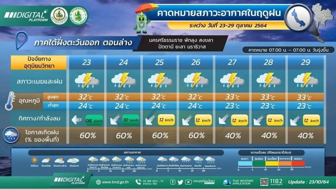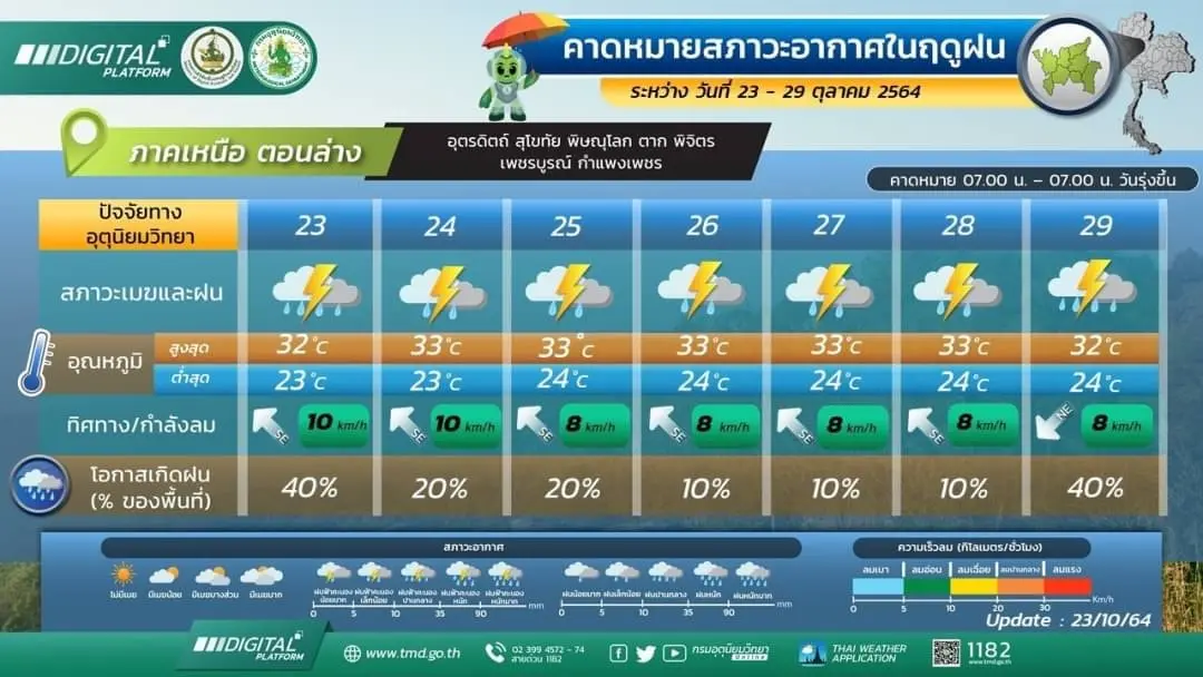 เมื่อวันที่ 23 ตุลาคม 2564 ทางเพจเฟซบุ๊ก กรมอุตุนิยมวิทยา พยากรณ์สภาพอากาศใน 7 วันข้างหน้า นับตั้งแต่ช่วงวันที่ 23-29 ตุลาคม 2564 บริเวณความกดอากาศสูงจากประเทศจีนยังคงปกคลุมประเทศไทยตอนบนและทะเลจีนใต้ ประกอบกับลมตะวันออกและลมตะวันออกเฉียงเหนือพัดปกคลุมประเทศไทยตอนบน ทำให้ประเทศไทยตอนบนจะมีฝนลดลง ส่วนภาคใต้ยังคงมีฝนตกต่อเนื่องและมีฝนตกหนักบางแห่ง