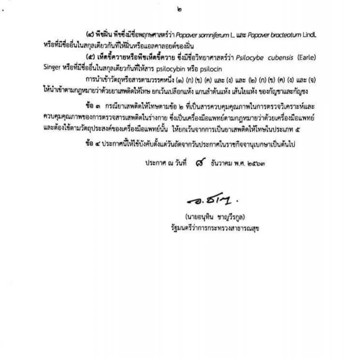 กัญชา ผู้สื่อข่าวรายงานว่า นายอนุทิน ชาญวีรกูล รองนายกรัฐมนตรี และ รมว.สาธารณสุข ได้ลงนามในประกาศกระทรวงสาธารณสุข เรื่องระบุชื่อยาเสพติดให้โทษประเภท 5 โดยมีสาระสำคัญคือ การประกาศให้ เส้นใย เปลือก กิ่ง ก้าน ราก และ ใบซึ่งไม่มียอดหรือช่อดอกติดมาด้วย ไม่เป็นยาเสพติด อีกต่อไป แต่ทั้งนี้ จะต้องเป็นผลผลิตที่ได้จากต้นกัญชาที่ได้รับอนุญาตปลูกอย่างถูกต้องตามกฎหมาย จากคณะกรรมการควบคุมยาเสพติด