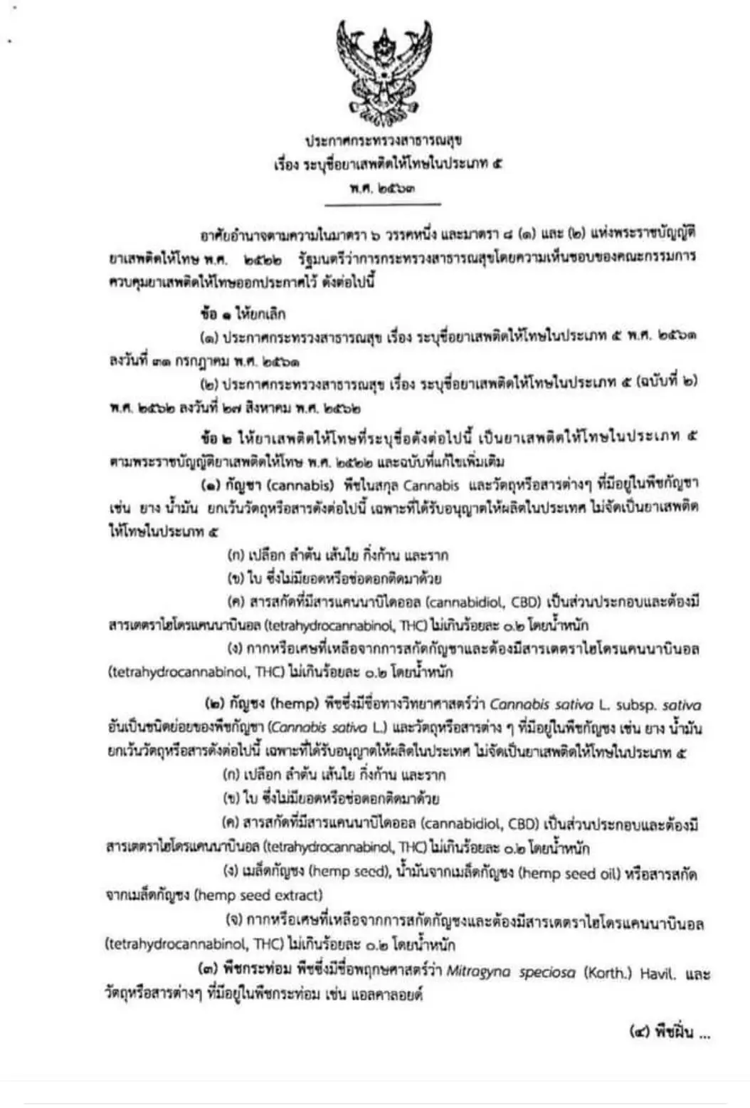 ประกาศกระทรวงสาธารณสุข ฉบับนี้ เป็นการการเปลี่ยนแปลงที่สำคัญ เกี่ยวกับกัญชา โดยมีการปลดส่วนต่างๆ ของกัญชา ออกจากยาเสพติดเกือบทั้งหมด คงเหลือเพียงดอก กับเมล็ด เท่านั้น ที่ยังกำหนดให้เป็นยาเสพติด เนื่องจากมี สาร THC เกินกว่าร้อยละ 0.2 โดยน้ำหนัก ซึ่งเป็นข้อกำหนดตามกฎหมาย และเป็นไปตามข้อกำหนดของสหประชาชาติ