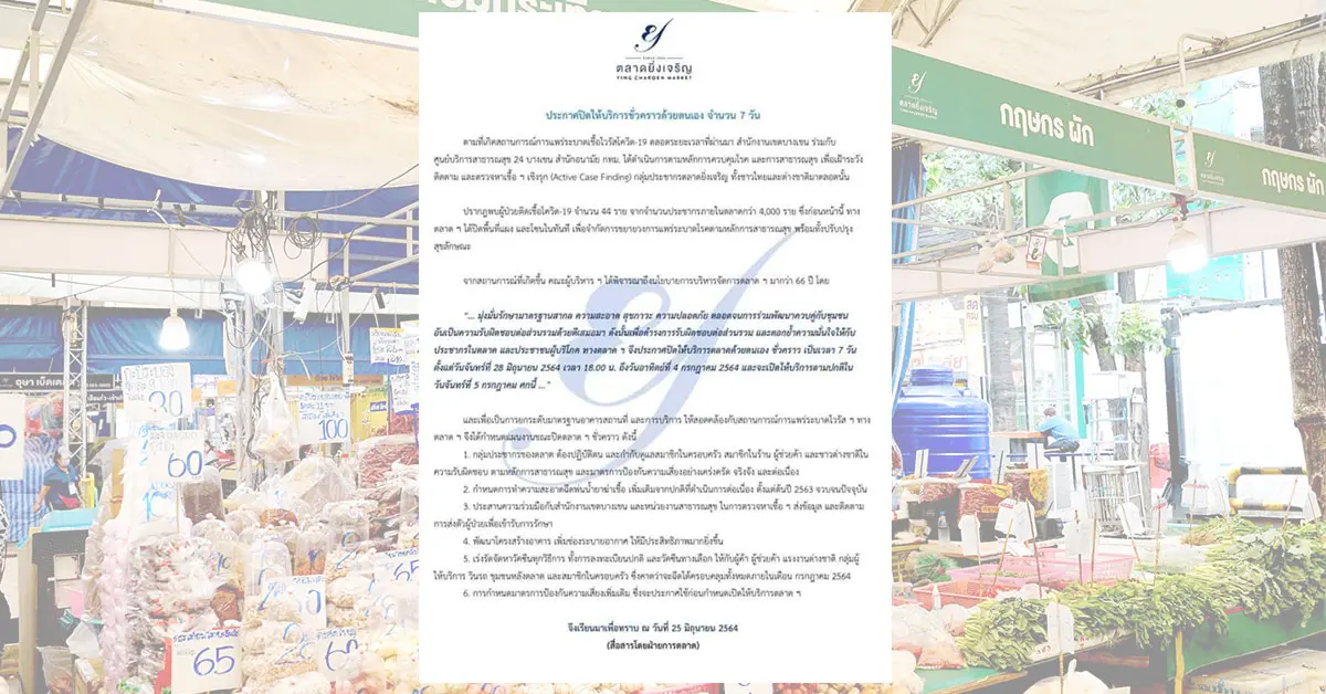 ตลาดยิ่งเจริญ สะพานใหม่ แจ้งปิดตลาดเป็นเวลา 7 วัน หลังมรผู้ติดเชื้อโคสิด-19 ถึง 44 ราย ทางตลาดเร่งจัดหาวัคซีนเพื่อบริการให้ผู้ค้า และ แรงงาน