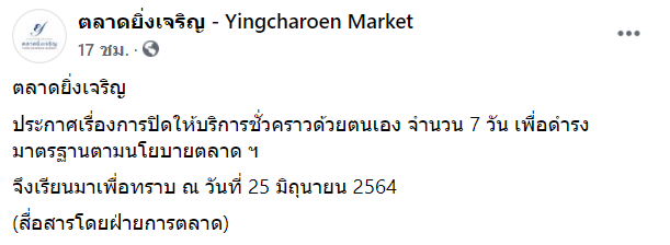 เมื่อวันที่ 25 มิถุนายน ทางเพจเฟซบุ๊ก ตลาดยิ่งเจริญ แจ้งปิดทำการตลาดเป็นเวลา 7 วัน ตั้งแต่วันที่ 28 มิถุนายน – เวลา 18.00 น. ถึงวันอาทิตย์ที่ 4 กรกฎาคม 2564 และจะเปิดให้บริการตามปกติใน วันจันทร์ที่ 5 กรกฎาคม 2564 สืบเนื่องมาจากพบผู้ติดเชื้อโควิด-19 จำนวน 77 ราย