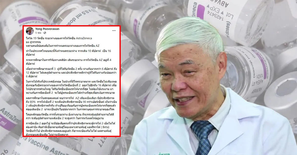 หมอยง หรือ ยง ภู่วรวรรณ โพสต์ชี้แจงประเด็น ทำไม “แอสตร้าเซนเนก้า” เข็ม 2 ถึงห่างออกไปกว่า 16 สัปดาห์ เผย ประสิทธิภาพดีกว่า