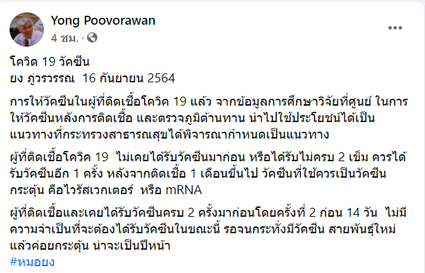 เมื่อวันที่ 16 กันยายน 2564 ทางด้านของศ.นพ.ยง ภู่วรวรรณ หัวหน้าศูนย์เชี่ยวชาญเฉพาะทางด้านไวรัสวิทยาคลินิก ภาควิชากุมารเวชศาสตร์ คณะแพทยศาสตร์ จุฬาลงกรณ์มหาวิทยาลัย โพสต์ข้อมูลวิจัยเกี่ยวกับการรับวัคซีนโควิด-19 ในกลุ่มผู้ป่วยติดเชื้อโควิด-19 ผ่านทางเฟซบุ๊กส่วนตัว Yong Poovorawan โดยระบุว่า
