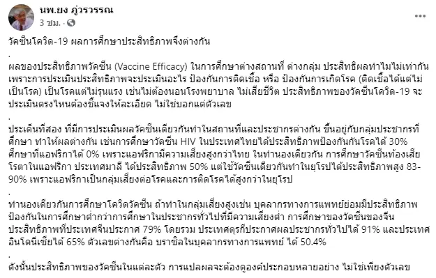 “ผลของประสิทธิภาพวัคซีน (Vaccine Efficacy) ในการศึกษาต่างสถานที่ ต่างกลุ่ม ประสิทธิผลทำไมไม่เท่ากันเพราะการประเมินประสิทธิภาพจะประเมินอะไร ป้องกันการติดเชื้อ หรือ ป้องกันการเกิดโรค (ติดเชื้อได้แต่ไม่เป็นโรค) เป็นโรคแต่ไม่รุนแรง เช่นไม่ต้องนอนโรงพยาบาล ไม่เสียชีวิต ประสิทธิภาพของวัคซีนโควิด-19 จะประเมินตรงไหนต้องชี้แจงให้ละเอียด ไม่ใช่บอกแต่ตัวเลข