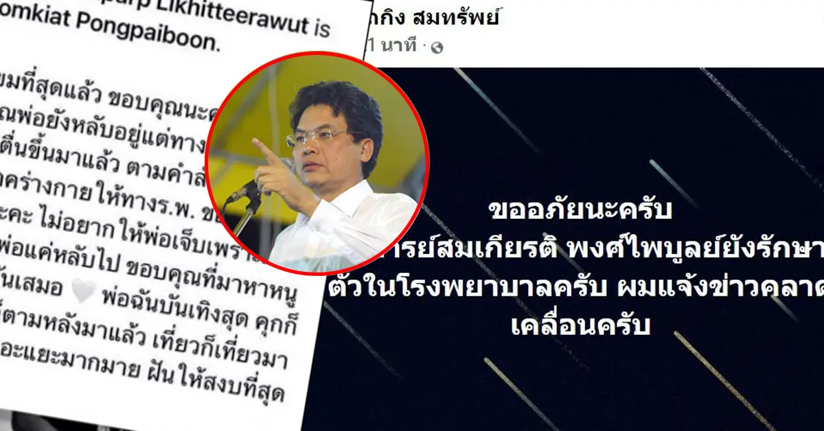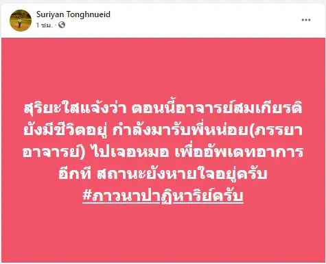 ต่อมา นายสุริยันต์ ทองหนูเอียด ได้โพสต์ผ่านเฟซบุ๊ก Suriyan Tonghnueid ได้ออกมาโพสต์ชี้แจงถึงเรื่องข่าวการเสียชีวิตของ นายสมเกียรติ พงษ์ไพบูลย์ ว่านายสุริยะใส กตะศิลา ได้แจ้งว่า ตอนนี้ อ.สมเกียรติ ยังมีชีวิตอยู่ และตอนนี้กำลังรับตัวภรรยาของ อ.สมเกีรติไปเจอแพทย์ เพื่ออัพเดต อาการอีกที ขณะที่สถานะตอนนี้ของ อ.สมเกียรติ คือ ยังหายใจอยู่ #ภาวนาปาฏิหาริย์ครับ