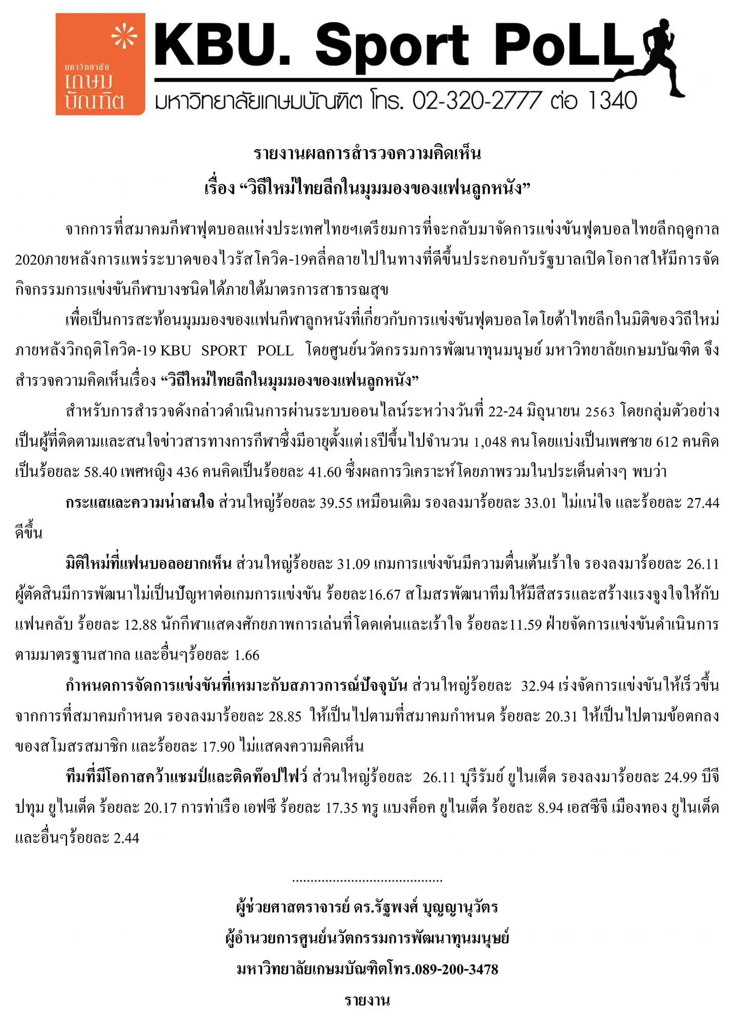 ไทยลีก KBU Sport Poll โดยศูนย์นวัตกรรมการพัฒนาทุนมนุษย์ มหาวิทยาลัยเกษมบัณฑิต เผยผลสำรวจโพลล์ความคิดเห็นจากผู้สนใจกีฬาอายุ18 ปี ขึ้นไป จำนวน 1,048 คน ช่วงวันที่ 22-24 มิ.ย.63 ว่าทีมใดจะมีโอกาสคว้าแชมป์ฟุตบอล ไทยลีก ฤดูกาล 2020 (T1)