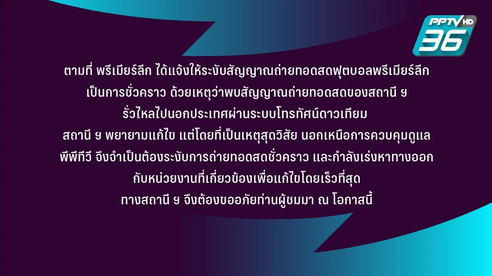 “สถานีโทรทัศน์พีพีทีวี เอชดี ช่อง 36 ในฐานะผู้ได้รับสิทธิ์ในการถ่ายทอดสดฟุตบอลพรีเมียร์ลีก ฤดูกาล 2019/20 ได้แจ้งถึงกรณีที่ พรีเมียร์ลีก ส่งหนังสือแจ้งให้ระงับการถ่ายทอดสดฟุตบอลพรีเมียร์ลีกเป็นการชั่วคราว เนื่องจากมีการรั่วไหลของสัญญาณไปนอกประเทศไทยผ่านระบบโทรทัศน์ดาวเทียม ทางสถานีฯ จึงจำเป็นต้องงดการถ่ายทอดสดชั่วคราว โดยมีผลตั้งแต่วันเสาร์ที่ 26 ตุลาคมนี้ เป็นต้นไป โดยทางสถานีฯ ได้มีการสื่อสารกับผู้ชมผ่านทางหน้าจอ และช่องทางออนไลน์ถึงข้อขัดข้องดังกล่าว แต่โดยที่เป็นเหตุสุดวิสัย นอกเหนือการควบคุมดูแล พีพีทีวี จึงจำเป็นต้องระงับการถ่ายทอดสดชั่วคราว และกำลังเร่งหาทางออกกับหน่วยงานที่เกี่ยวข้องเพื่อแก้ไขโดยเร็วที่สุด”