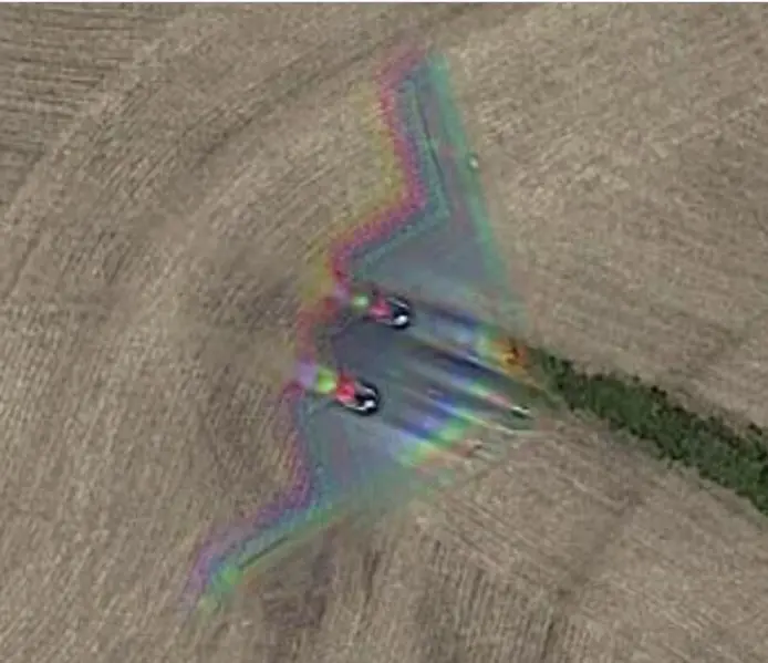 และที่ต้องหยิบยกเรื่องราวข้างต้นขึ้นมานั้นก็เพราะว่าได้มีเรื่องราวสุดพิลึกเกิดขึ้นจนกลายเป็นไวรัลไปทั่วโลกออนไลน์หลักจากเว็บไซต์ PetaPixel รายงานว่ามีผู้ใช้ Reddit รายหนึ่งบังเอิญไปเจอ ภาพเครื่องบินทิ้งระเบิดล่องหน B-2 Spirit อยู่ภายในพื้นที่รัฐมิสซูรี สหรัฐอเมริกา ห่างจากเมืองแคนซัสซิตี ทางตะวันออกไปประมาณ 80 กิโลเมตร ถูกพบที่พิกัด 39°01’18.5″,-93°35’40.5″ บน Google Maps ซึ่งมาจากกล้องดาวเทียมจับภาพ 3 สี แยกกัน ได้แก่ สีแดง สีเขียว และสีน้ำเงิน (RGB) ก่อนที่จะรวมกันจนกลายมาเป็นภาพดังกล่าว