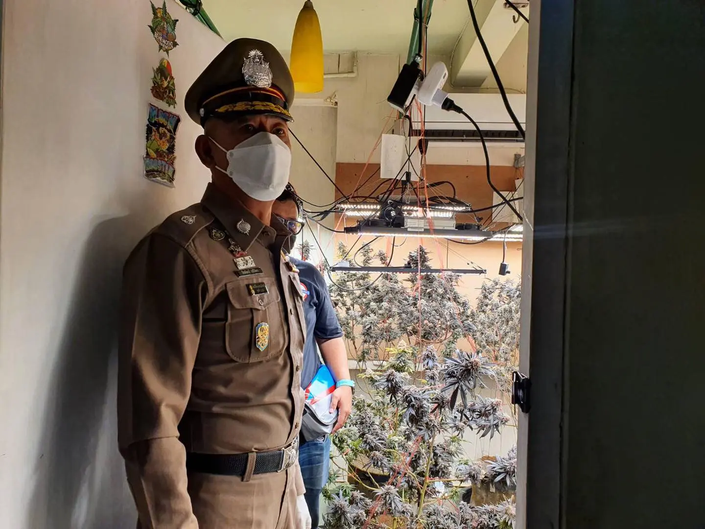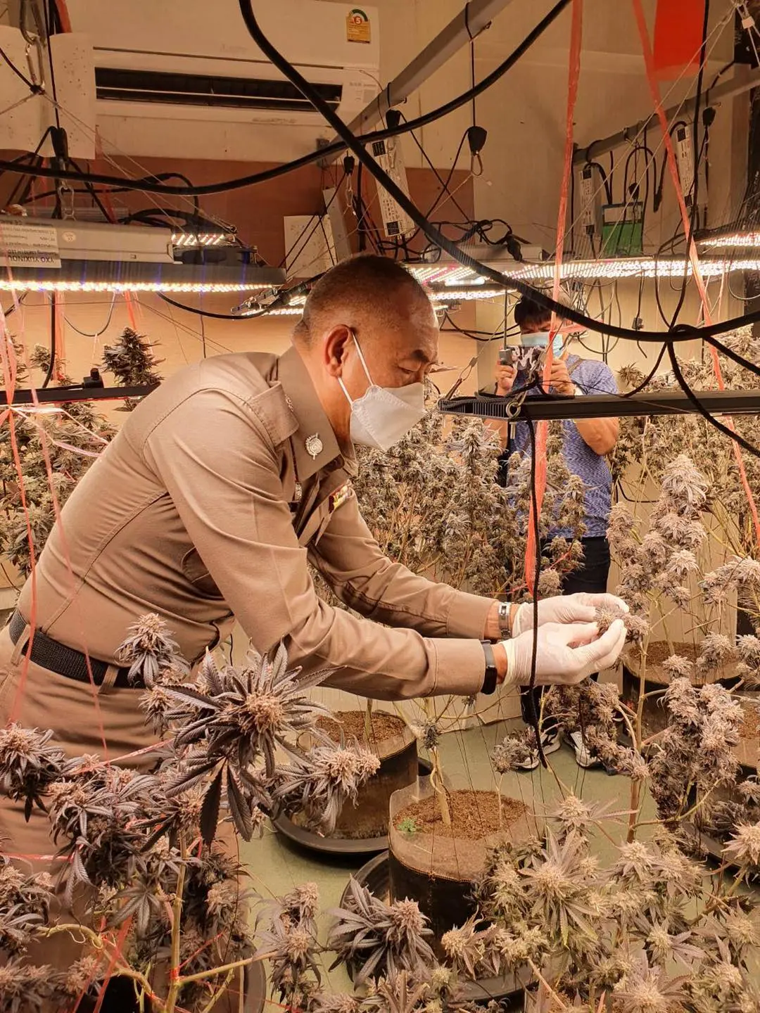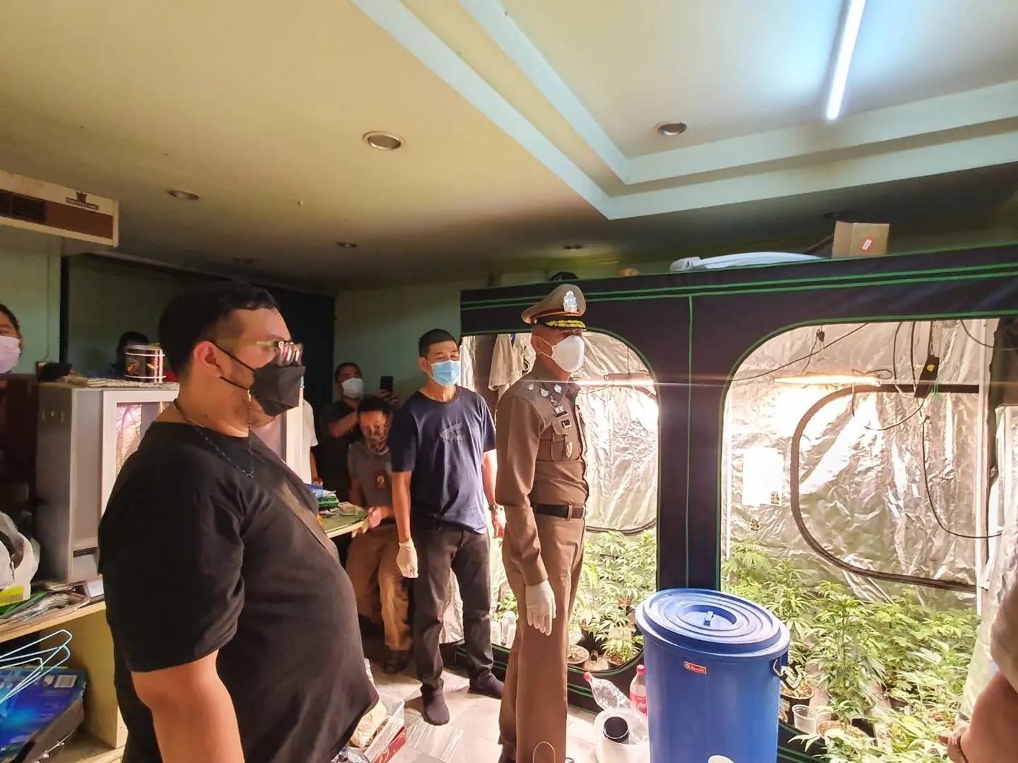 พบที่ชั้น 1 เปิดเป็นร้านขายผ้าม่าน ขายอาหารหมาล่า และกาแฟ ชั้น 2 เป็นที่พัก ชั้น 3 พบเป็นห้องเพาะกัญชาออแกนิก มีต้นกัญชา ความสูงประมาณ 5-7 นิ้ว จำนวน 200 ต้น เพาะอยู่ในกระถาง ภายในห้องแอร์เย็นช่ำ อุปกรณ์การเสพกัญชา และอุปกรณ์สกัดน้ำมันกัญชา ชั้น 4 เป็นห้องเพาะกัญชาออแกนิกเหมือนกัน พบต้นกัญชามีดอกใบสมบูรณ์ ความสูง ประมาณ 1 เมตร จำนวน 19 ต้น ส่วนชั้น 5 เป็นห้องเก็บของพล.ต.ท.จิรพัฒน์ กล่าวว่า จากการสอบสวนนายจิรวิชญ์ ให้การว่า เปิดร้านอาหารและขายผ้าม่านบังหน้า เพาะและขายน้ำมันกัญชา มานานเกือบ 2 ปี โดยสั่งเม็ดกัญชา พันธ์เชอรี่ จากอเมริกา ผ่านทางเฟซบุ๊ก พร้อมซื้ออุปกรณ์ต่างๆที่ใช้เพาะ ดูแล สกัดน้ำมัน ลงทุนไปเป็นเงินจำนวน 5 หมื่นบาท
