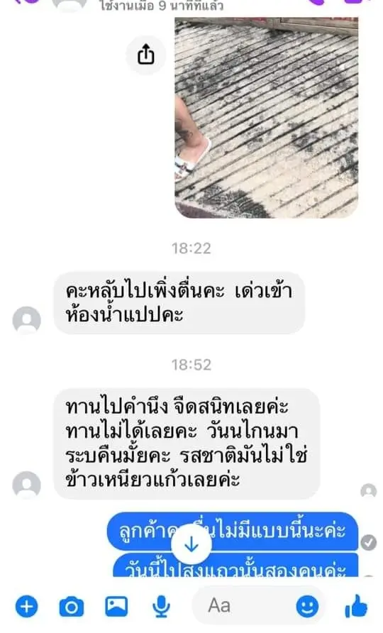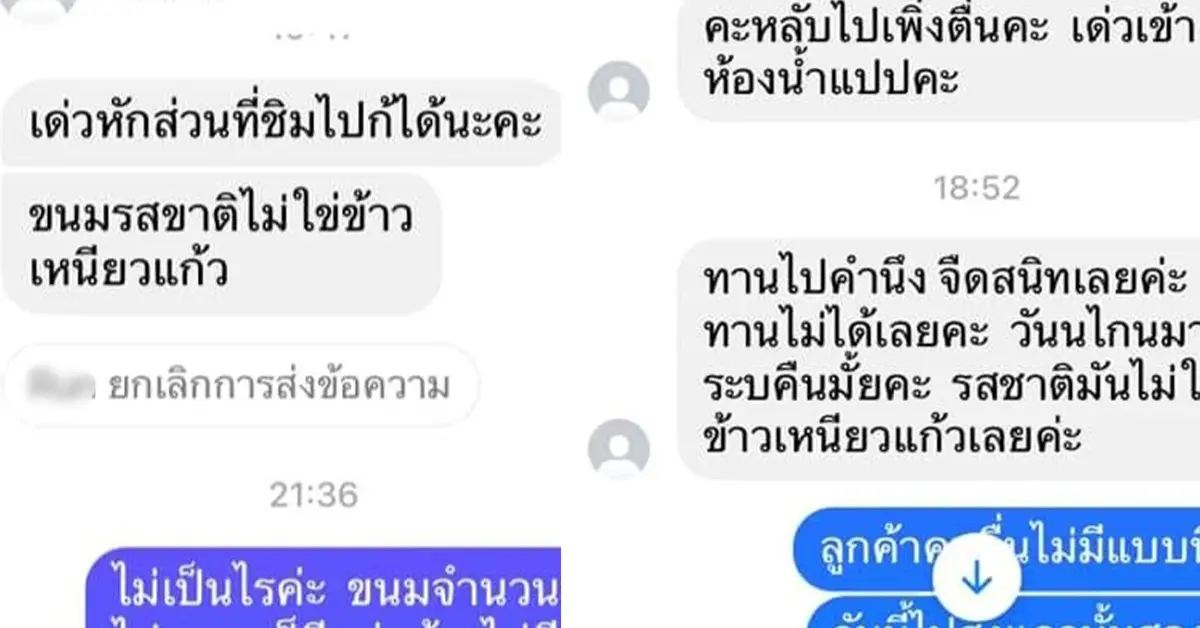 แต่เมื่อไปถึงลูกค้ากลับไม่รับโทรศัพท์ แต่ พิมพ์แชทมาว่างให้ส่งของไว้ พร้อมทั้งขอเลขบัญชีอ้างว่าเข้าห้องน้ำ ตัวแม่ค้าเองก็ไม่ได้ติดใจอะไรจึงส่งของไว้ แต่ลูกค้าก็ไม่โอนเงินค่าข้าวเหนียวแก้วมาสักที แต่ทักมาบอกว่าขนมไม่อร่อย ให้มารับของคืน ซึ่งแม่ค้าก็ไม่ยอมเพราะไม่มีที่ไหนเขาทำกัน ลูกค้าตีมึน ตอบกลับ งั้นหักส่วนต่างที่กินไปก็ได้ สุดท้ายแม่ค้ารู้ว่าเถียงไปก็เสียเวลายอมถอดใจ ถือว่าพลาดเองและจะนำเรื่องนี้ไปเป็นบทเรียน และ ปรับปรุงขนมให้อร่อยยิ่งขึ้น