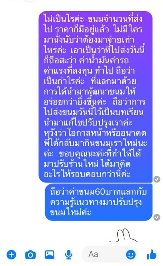 ถึงบ้านเราโทรหาก็ไม่รับทั้งเบอร์โทรศัพท์ ลูกค้าบอกจะโอนให้ตอนเย็นๆแต่ก็ไม่มียอดและได้คำติชมมา เราพึ่งเข้าใจว่าสั่งขนมแล้วต้องชิมก่อนถึงจะจ่ายตัง แต่ไม่เป็นไรค่ะ ค่าแรง ค่ารถ ค่าขนมที่ลงทุนไป แค่เงิน60฿ เราจะถือว่าเป็นกำไรที่ทำให้เราได้เห็นข้อผิดพลาดของตัวเอง ได้นำมาพัฒนาให้ดีกว่าเดิม ถือว่ากำไรที่ได้มามีค่ากว่าเงิน 60฿ เราก็ขอบคุณค่ะที่ชี้แนวทางเรา ไว้โอกาสหน้าลูกค้าได้แวะมาอุดหนุนใหม่นะคะ อาจจะได้ดีกว่าเดิมค่ะ