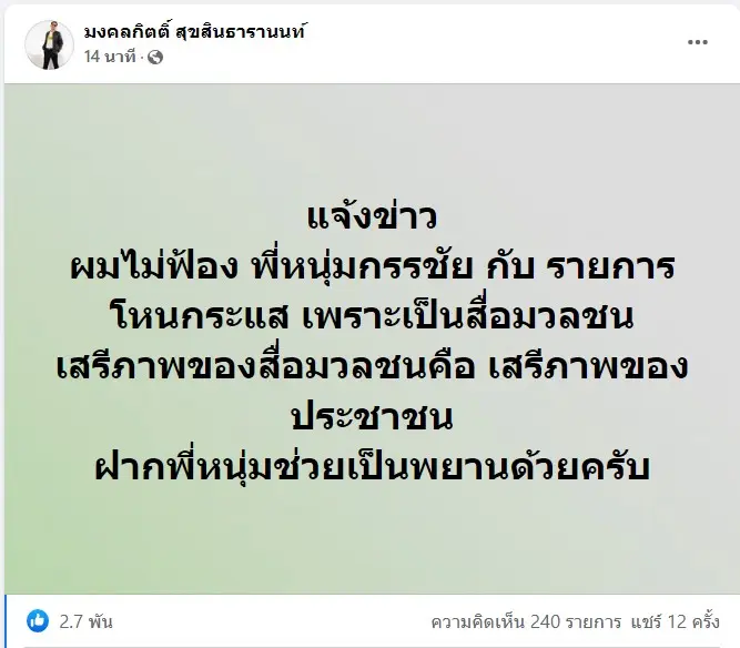 แจ้งข่าวผมไม่ฟ้อง พี่หนุ่มกรรชัย กับ รายการโหนกระแส เพราะเป็นสื่อมวลชน เสรีภาพของสื่อมวลชนคือ เสรีภาพของประชาชนฝากพี่หนุ่มช่วยเป็นพยานด้วยครับ