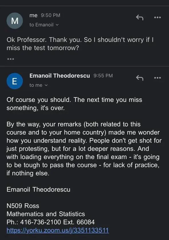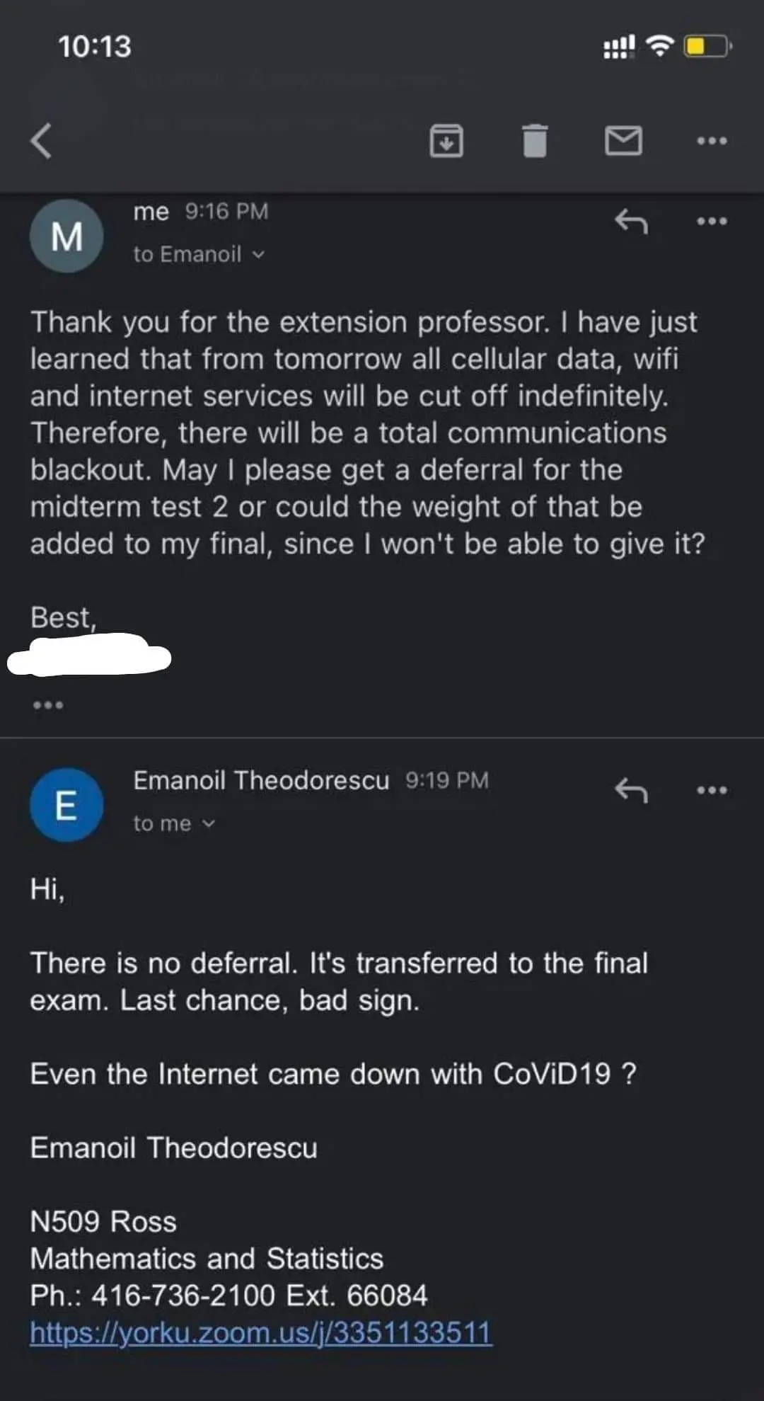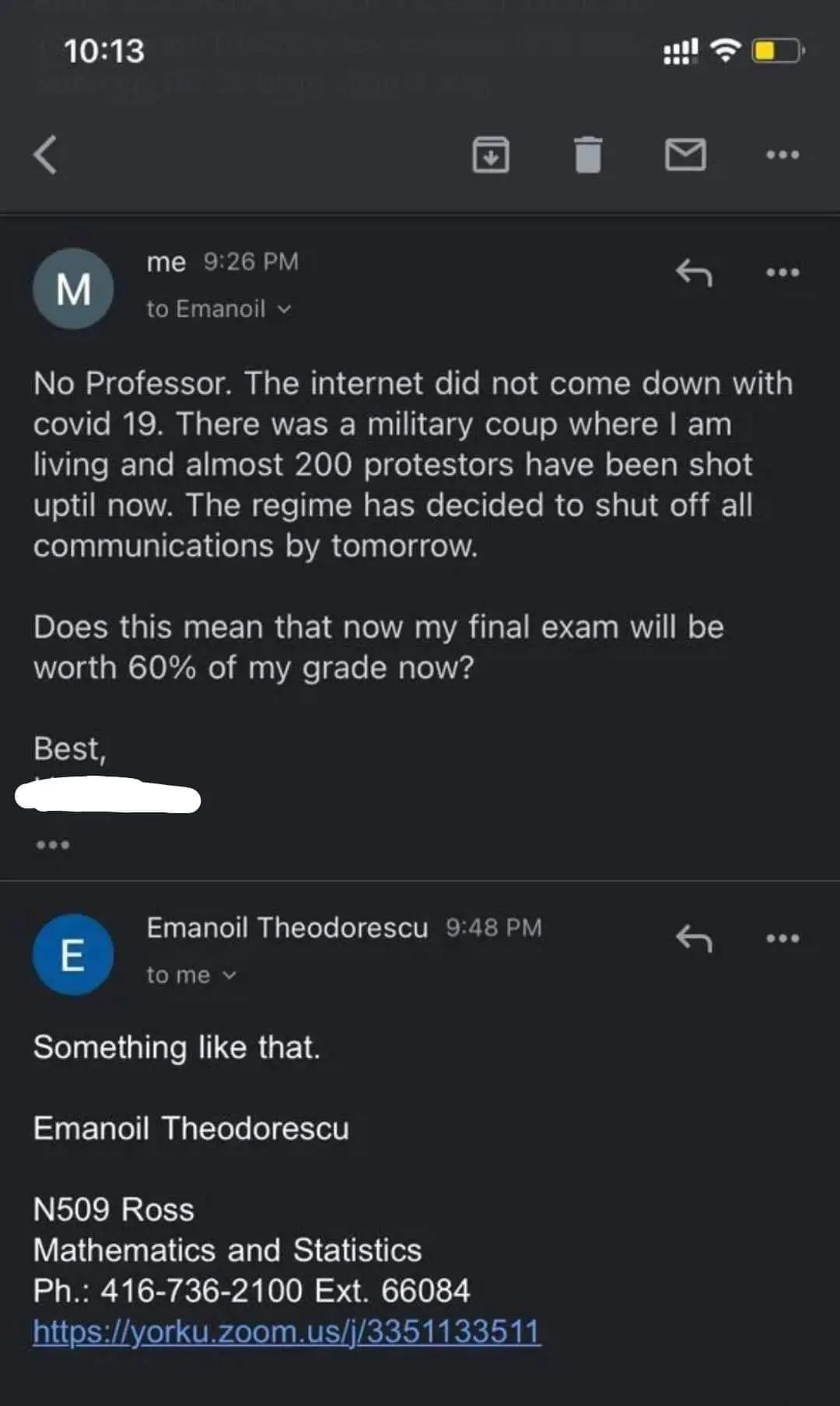 ขออนุญาตยกยอดไปรวมกับไฟนอลเลยได้หรือไม่ เพราะอย่างที่แจ้งไปว่าไม่สามารถทำสอบได้”อาจารย์คนนี้ชื่อ Emanoil Theodorescu ได้ตอบว่า”ไม่มีการเลื่อนออกไปให้ทั้งนั้น ทำไม่ได้ก็ไปทำตอนไฟนอลเป็นโอกาสสุดท้ายเอาละกันแล้วไง ตอนโควิดเน็ตก็ไม่ได้ล่มหนิ”ซึ่งอ่านละอึ้งนะตรงๆ แต่คิดว่าจุดนั้นอาจารย์อาจจะคิดว่านักศึกษาอ้างชัวร์ อ่านไม่ทันละมาอ้างเปล่า อาจจะไม่รู้ว่าเด็กมาจากพม่า และไม่ติดตามข่าวสถานการณ์โลกใดนักศึกษาเลยตอบกลับไปว่า