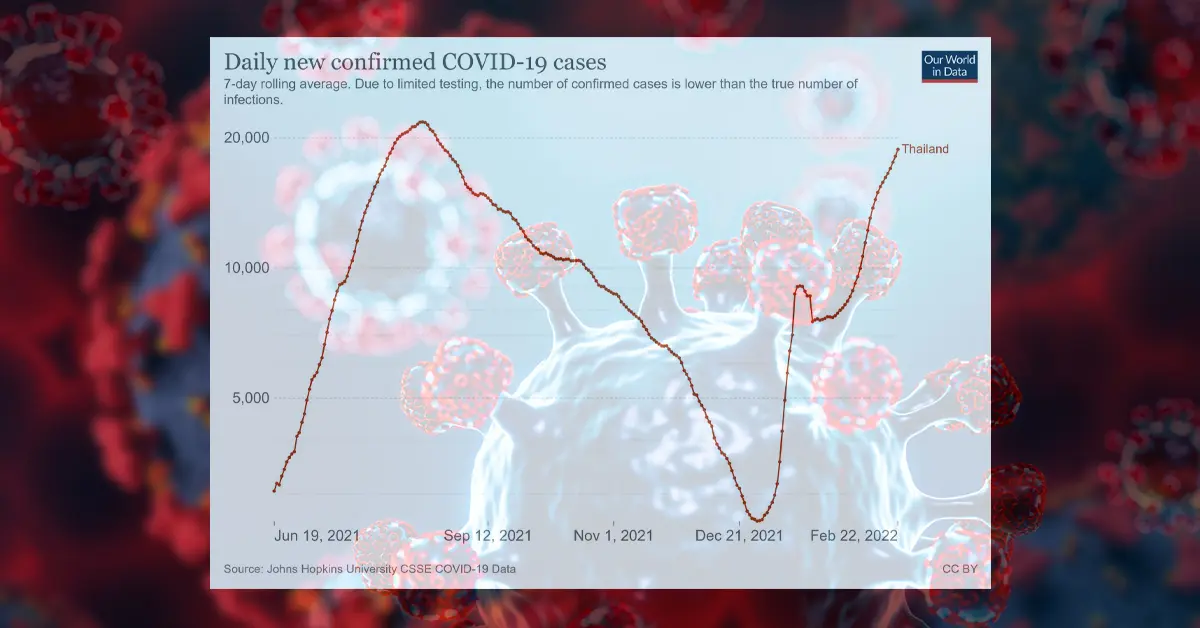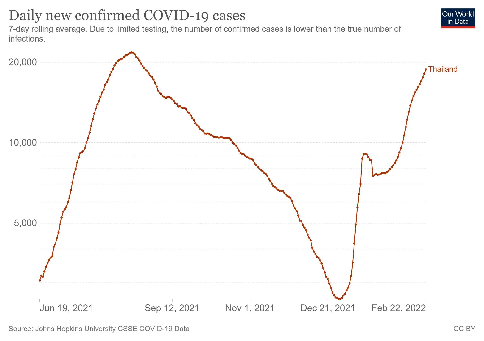 กราฟการระบาดของตัวเลขติดเชื้อยืนยันในแต่ละวันนั้นไม่ได้สะท้อนสถานการณ์จริง เพราะคนจำนวนมากมายที่ไม่ได้เข้าถึงการตรวจ RT-PCR แต่ตรวจด้วย ATK หากรวมรายงานจำนวน ATK ที่เห็นในเว็บของหน่วยงานรัฐที่เกี่ยวข้อง จะพบว่าจำนวนติดเชื้อรวมในแต่ละวันทะลุไปเกือบ 2 เท่าของระลอกเดลต้า