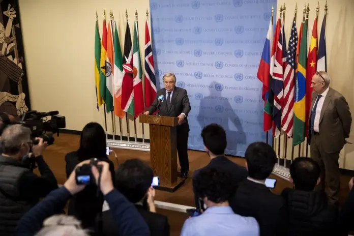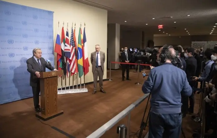 กูเตอร์เรสได้แถลงข่าว ณ สำนักงานใหญ่สหประชาชาติในนครนิวยอร์กของสหรัฐฯ หลังจากเสร็จสิ้นการประชุมฉุกเฉินของคณะมนตรีความมั่นคงแห่งสหประชาชาติ (UNSC)