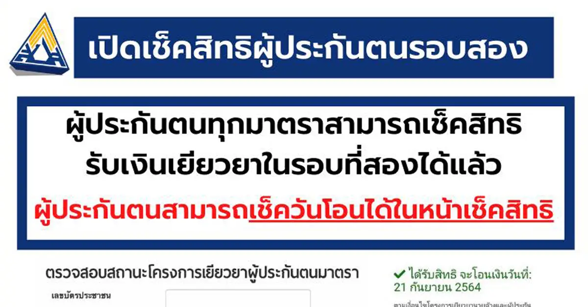 ล่าสุดวันนี้ (17 ก.ย.) เพจเฟซบุ๊ก แจ้งข่าวประกันสังคม ได้เปิดให้เช็คสิทธิผู้ประกันตน รอบสองสำหรับผู้ประกันตนในทุกมาตราเบื้องต้นสามารถเช็คสิทธิรับเงินเยียวยาในรอบที่สองได้แล้วโดยช่วงเวลาการโอนเงินจะอยู่ระหว่าง 20-30 กันยายน