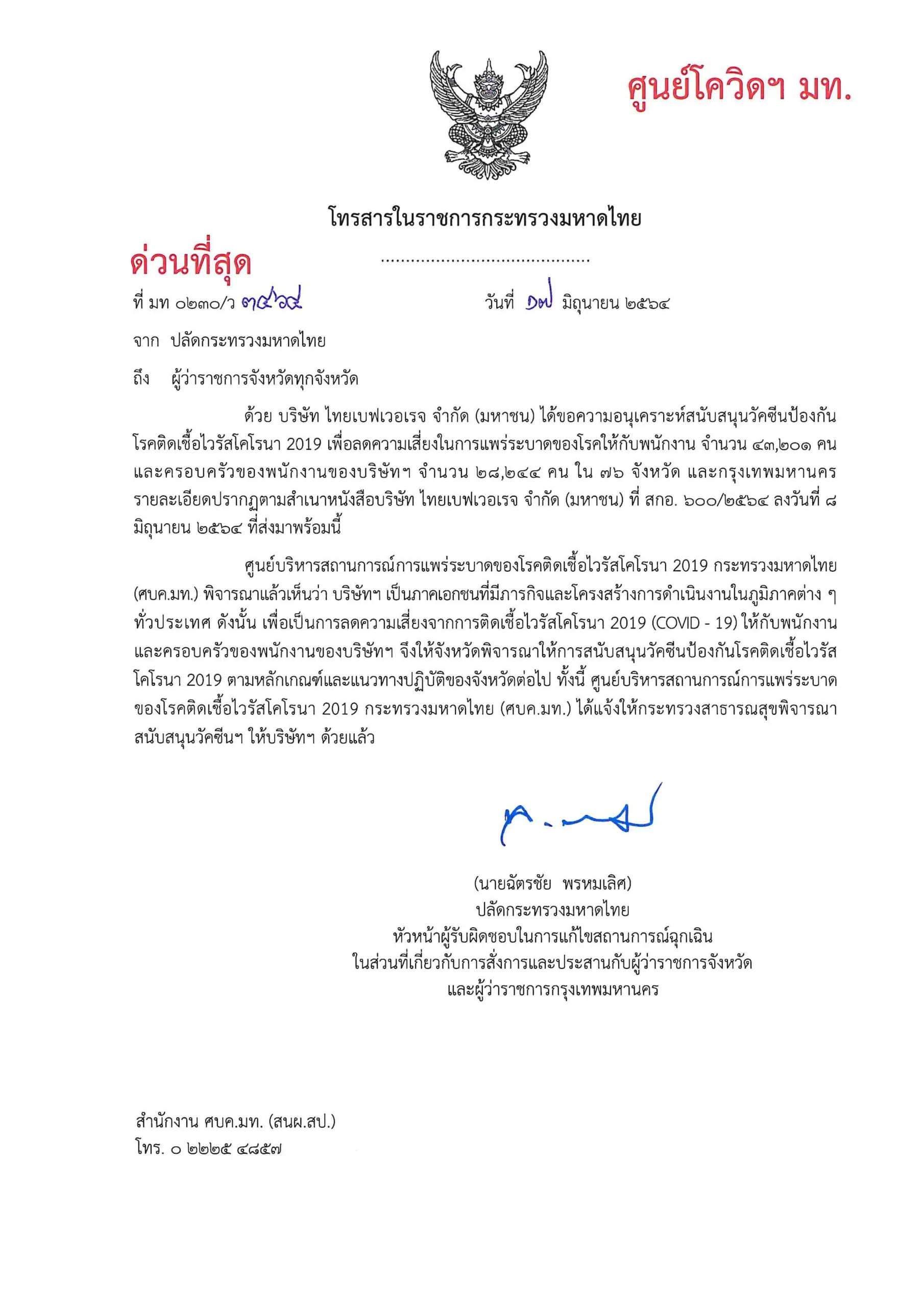 ปลัดมหาดไทย ยัน คำสั่ง สนับสนุนวัคซีน “ไทยเบฟ” ทำตามขั้นตอน – จากกรณี ศูนย์บริหารสถานการณ์โควิด กระทรวงมหาดไทย (ศบค.มท.) ส่งไปยังผู้ว่าราชการทุกจังหวัด เมื่อวันที่ 17 มิถุนายนที่ผ่านมา โดยบริษัท ไทยเบฟเวอเรจ จำกัด (มหาชน) ได้ขอความอนุเคราะห์สนับสนุนวัคซีนโรคติดเชื้อไวรัสโคโรนา 2019 เพื่อลดความเสี่ยงในการแพร่ระบาดของโรคให้กับพนักงาน จำนวน 43,201 คน และครอบครัวของพนักงานของบริษัทจำนวน 28,244 คน ใน 76 จังหวัด และกรุงเทพมหานคร รวมเป็นจำนวนกว่า 7 หมื่นคน จึงทำให้ประชาชนเกิดความไม่พอใจและตั้งคำถามถึงแนวทางการกระจายวัคซีนโควิด-19 ว่าเป็นไปอย่างเป็นธรรม ยุติธรรม และทั่วถึงหรือไม่