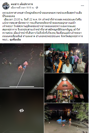 สาวใหญ่จมน้ำดับ – ตรวจเร่งหาสาเหตุสาวใหญ่พลัดตกน้ำลอยคอขอความช่วยเหลือสุดท้ายเสียชีวิตลอยคอ เมื่อเวลา 23.00 น. วันที่ 22 พ.ค. 64 เจ้าหน้าที่ตำรวจสภ.พระประแดงได้รับแจ้งจากสองสามีภรรยาว่า พบเห็นคนพลัดตกน้ำลอยคออยู่กลางแม่น้ำเจ้าพระยา ใกล้สะพานภูมิพลช่องปากอ่าวลอยต่อระหว่างเขตกทมและสมุทรปราการ จึงเร่งประสานเจ้าหน้าที่อาสาสมัครมูลนิธิร่วมกตัญญู เข้าให้ความช่วย เมื่อเจ้าหน้าที่เดินทางไปถึงยังที่เกิดเหตุ ริมเขื่อนแม่น้ำเจ้าพระยา ถนนนครเขื่อนขันธ์ ตำบลตลาด อำเภอพระพระประแดง จังหวัดสมุทรปราการ พบว่าหญิงสาวคนดังกล่าวลอยคว่ำหน้าอยู่กลางแม่น้ำ