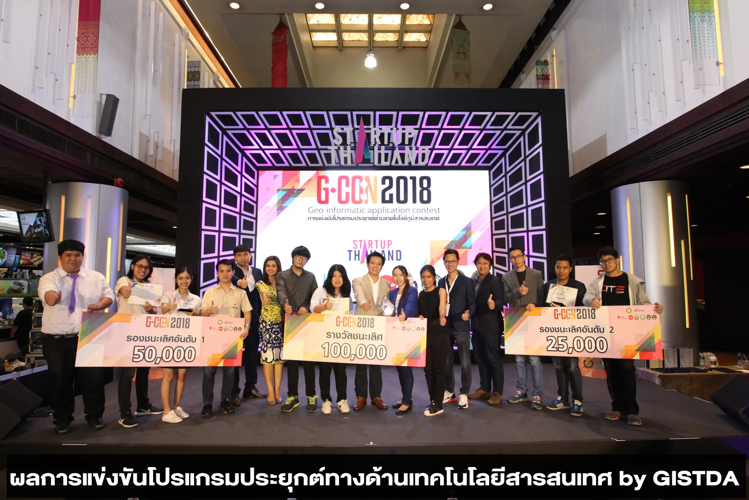 ในวันเสาร์ที่ 19 พฤษภาคม 2561 สำนักงานพัฒนาเทคโนโลยีอวกาศและภูมิสารสนเทศ (สทอภ.) หรือ GISTDA (จิสด้า) ได้จัดการแข่งขันโปรแกรมประยุกต์ทางด้านเทคโนโลยีภูมิสารสนเทศ “Geo-informatics Applications Contest : G-CON 2018” หัวข้อ Agritech และ Travetech ภายใต้งาน Startup Thailand 2018 ซึ่งเป็นโครงการที่ช่วยเสริมสร้างแนวคิดการพัฒนาและต่อยอดให้แอพพลิเคชั่นสามารถใช้งานได้จริง บนข้อมูลที่มีความถูกต้อง และใช้ได้อย่างยั่งยืน สอดคล้องกับยุทธศาสตร์ด้านการพัฒนาและส่งเสริมการประยุกต์ใช้เทคโนโลยี เพื่อต่อยอดในเชิงพาณิชย์อย่างก้าวกระโดด และการพัฒนาในรูปแบบธุรกิจนวัตกรรม (Business Model Innovation) ทั้งนี้ ในการจัดแข่งขันมุ่งหมายเพื่อที่จะช่วยส่งเสริมและสนับสนุนการพัฒนาวิสาหกิจเริ่มต้น (Startup) ให้มีองค์ความรู้และสร้างมาตรฐาน ที่จะช่วยผลักดันการสร้างธุรกิจนวัตกรรมให้มีความเข้มแข็งและสามารถเติบโตได้อย่างยั่งยืนในเชิงพาณิชย์ต่อไป