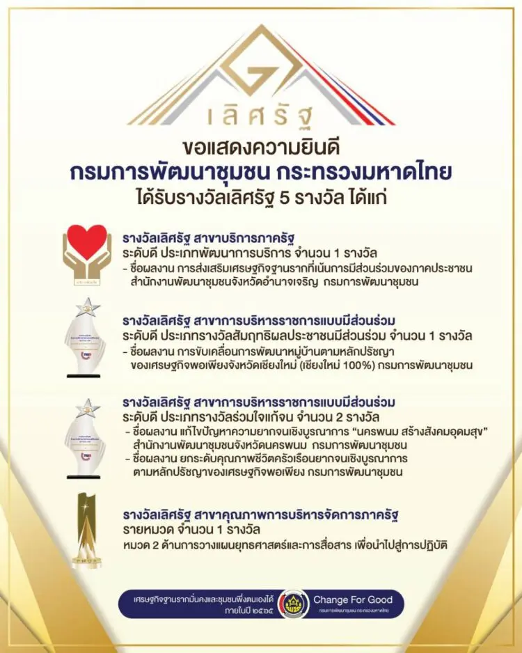 ทั้งนี้ กรมการพัฒนาชุมชน ได้รับรางวัลฯ จำนวน 5 รางวัล ได้แก่ 1) รางวัลเลิศรัฐ สาขาคุณภาพการบริหารจัดการภาครัฐ รายหมวด คือหมวด 2 ด้านการวางแผนยุทธศาสตร์และการสื่อสารเพื่อนำไปสู่การปฏิบัติ 2) รางวัลเลิศรัฐ สาขาบริการภาครัฐ ระดับดี ประเภทพัฒนาการบริการ จากผลงาน การส่งเสริมเศรษฐกิจฐานรากที่เน้นการมีส่วนร่วมของภาคประชาชน สำนักงานพัฒนาชุมชนจังหวัดอำนาจเจริญ 3) รางวัลเลิศรัฐ สาขาการบริหารราชการแบบมีส่วนร่วม ระดับดี ประเภทรางวัลสัมฤทธิผลประชาชนมีส่วนร่วม จากผลงาน การขับเคลื่อนการพัฒนาหมู่บ้านตามหลักปรัชญาของเศรษฐกิจพอเพียงจังหวัดเชียงใหม่ (เชียงใหม่100%) 4) รางวัลเลิศรัฐ สาขาการบริหารราชการแบบมีส่วนร่วม ระดับดี ประเภทรางวัลร่วมใจแก้จน ชื่อผลงาน แก้ไขปัญหาความยากจนเชิงบูรณาการ “นครพนม สร้างสังคมอุดมสุข” สำนักงานพัฒนาชุมชนจังหวัดนครพนม และ 5) รางวัลเลิศรัฐ สาขาการบริหารราชการแบบมีส่วนร่วม ระดับดี ประเภทรางวัลร่วมใจแก้จน ชื่อผลงานยกระดับคุณภาพชีวิตครัวเรือนยากจนเชิงบูรณาการ ตามหลักปรัชญาของเศรษฐกิจพอเพียง กรมการพัฒนาชุมชน