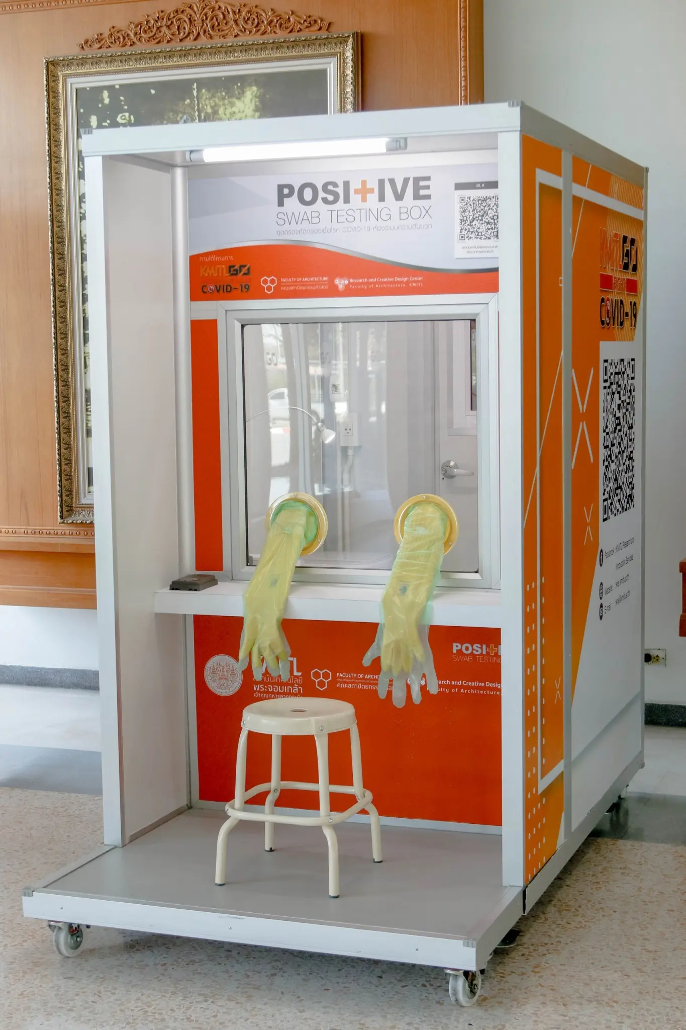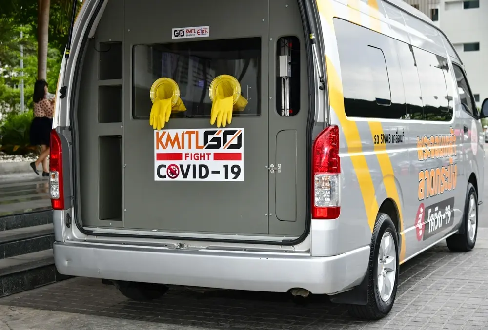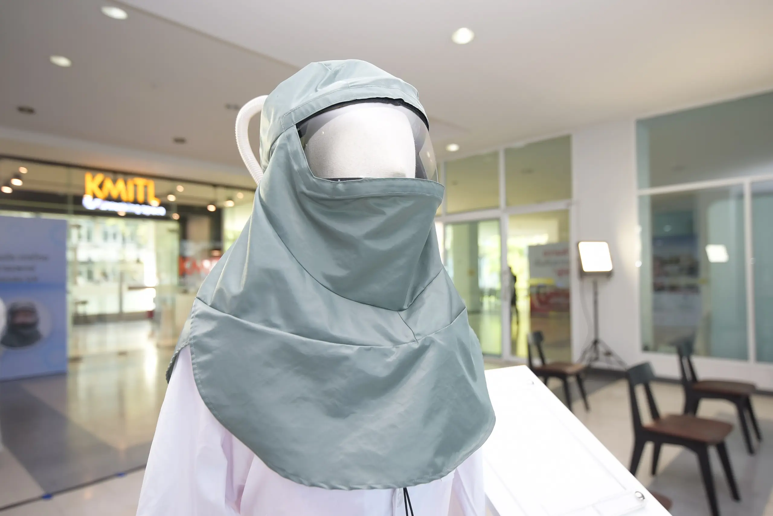 เพิ่มความปลอดภัยให้แก่บุคลากรทางการแพทย์ขณะตรวจผู้ที่มีความเสี่ยง• ตู้ตรวจเชื้อ (Swab Test) ความดันลบ (Negative Pressure) ใช้หลักการทำงานโดยผู้มีความเสี่ยงประจำอยู่ในตู้ ขณะที่แพทย์สอดมือเข้าไปทำหัตถการ Swab โดยภายในห้องใช้ระบบควบคุมความดันลบ พร้อมติดตั้งระบบกรองและฆ่าเชื้อด้วย UV-C และ HEPA ก่อนปล่อยอากาศสู่ภายนอก ป้องกันและควบคุมเชื้อไม่ให้ออกสู่ภายนอกเมื่อเปิดประตู • รถตู้ตรวจเชื้อ (Mobile Swab Test) ถูกพัฒนาขึ้นภายใต้แนวคิดการอำนวยความสะดวกโรงพยาบาล หน่วยงาน หรือจุดคัดกรอง สามารถเคลื่อนที่ไปได้ทุกที่ เพื่อใช้ตรวจเก็บตัวอย่างหาเชื้อโควิด-19 เชิงรุก ในพื้นที่ต่าง ๆ ทั่วประเทศ โดยมีการใช้ระบบปรับความดันอากาศภายในให้เป็นบวก เพื่อป้องกันอากาศภายนอกที่อาจปนเปื้อนเชื้อโรคไม่ให้ผ่านเข้าไปในตัวรถ ทำให้แพทย์ที่ประจำอยู่ในรถสามารถทำการตรวจเชื้อจากภายในได้อย่างปลอดภัย และสามารถรองรับการตรวจผู้ป่วยได้จำนวนมาก ถึง 100 คนต่อวัน• ชุด PAPRs ถูกออกแบบในการคลุมเฉพาะศีรษะ มีพัดลมพร้อมชุดกรองอากาศ (Blower box) พร้อมกับแบตเตอรี่ที่สามารถชาร์ตไฟบ้านได้ การออกแบบโดยประยุกต์การใช้งานของหมวก Safety ให้สวมใส่ง่าย สบาย และสามารถปรับให้พอดีกับศีรษะ ภายในหมวกมีความดันเป็นบวกคงที่ขณะสวมใส่ ลดการรั่วไหลของอากาศ Face Shield ใช้วัสดุการสะท้อนแสงทำให้มีวิสัยทัศน์ชัดเจน มีระบบการกรอง Filtration system สามารถใช้หัวกรองออกซิเจนและถอดประกอบได้ตามการใช้งานจริง