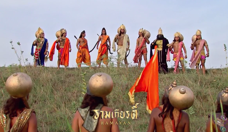 พระรามเดินทางมายังป่าฤศยมูกะเพื่อตามหาพญาวานรสุตรีพวะ หนุมานเห็นสองพี่น้องที่รุกล้ำเข้ามาในป่า แต่กลับไม่ทำร้ายเพราะรู้สึกว่าทั้งสองดูเหมือนผ้สูงศักดิ์อย่างที่ท่านชามพวานทำนายว่าจะมีมนุษย์จะมา สังหารคนของที่นี่
