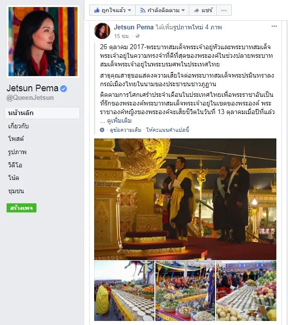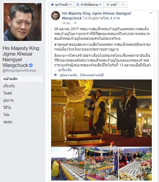 สมเด็จพระราชธิบดีจิกมี เคเซอร์ นัมเกล วังชุก และสมเด็จพระราชินี เจตซุน เพมา วังชุก ทรงโพสต์ภาพ Facebook ขณะที่พระองค์เสด็จพร้อมด้วยสมเด็จพระราชินี เสด็จพระดำเนินขึ้นสู่พระเมรุมาศ ในพระราชพิธีถวายพระเพลิงพระบรมศพ พระบาทสมเด็จพระปรมินทรมหาภูมิพลอดุลยเดช บรมนาถพิตร เมื่อวันที่ 26 ต.ค. ที่ผ่านมา พร้อมทรงโพสต์ข้อความถวายอาลัยแด่พระบาทสมเด็จพระปรมินทรมหาภูมิพลอดุลยเดช บรมนาถบพิตร