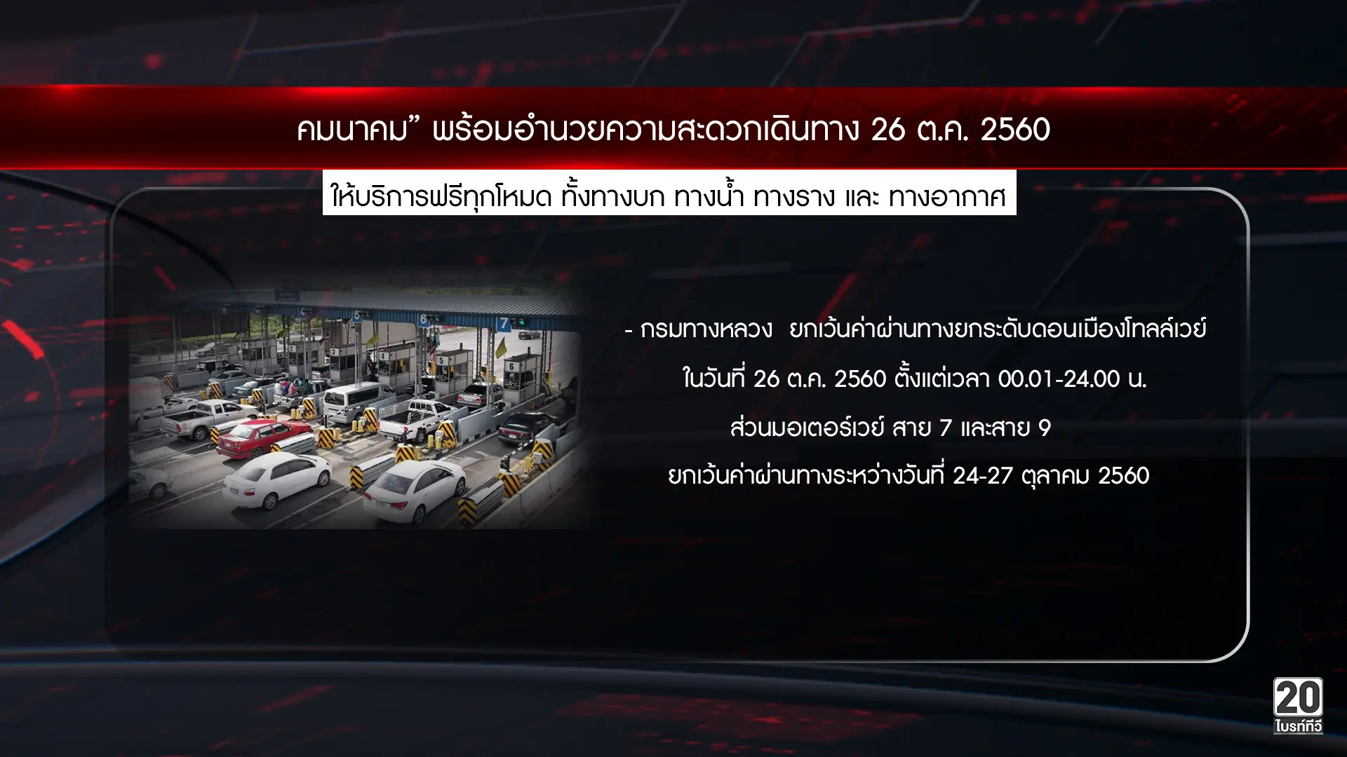 กรมทางหลวง (ทล.) ยกเว้นค่าผ่านทางยกระดับดอนเมืองโทลล์เวย์ ในวันที่ 26 ต.ค. 2560 ตั้งแต่เวลา 00.01-24.00 น. ส่วนมอเตอร์เวย์ สาย 7 และสาย 9 ยกเว้นค่าผ่านทางระหว่างวันที่ 24-27 ตุลาคม 2560