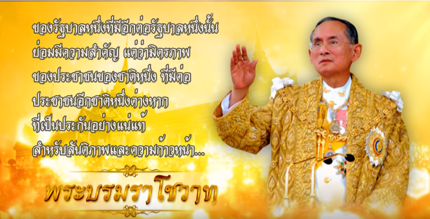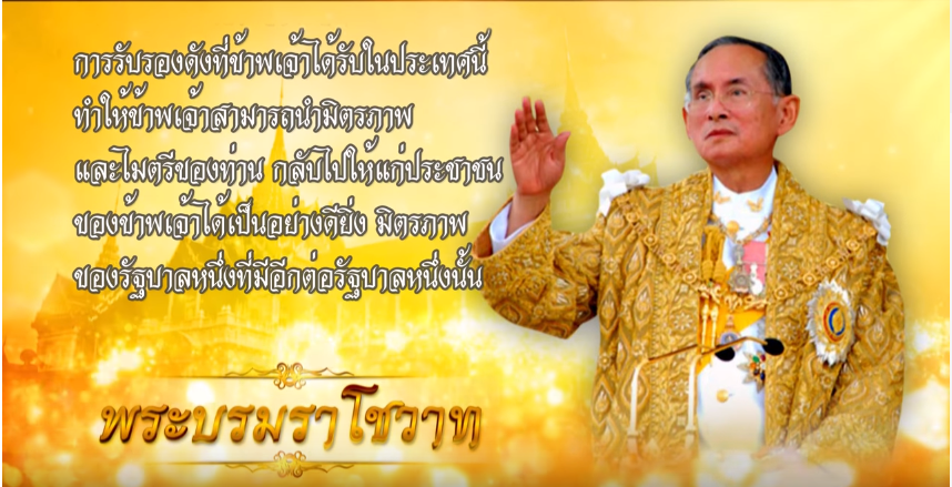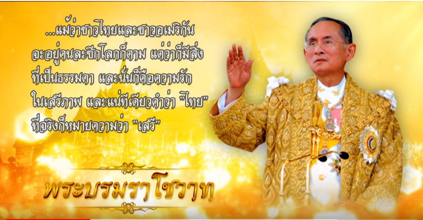แม้ว่าวไทยและชาวอเมริกันจะอยู่คนละซีกโลกก็ตาม แต่ว่าก็มีสิ่งที่เป็นธรรมดา และนั่นก็คือความรักในเสรีภาพ และแน่ทีเดียวคำว่า “ไทย” ที่จริงก็หมายความว่า “เสรี” การรับรองดังที่ข้าพเจ้าได้รับในประเทศนี้ ทำให้ข้าพเจ้าสามารถนำมิตรภาพและไมตรีของท่าน กลับไปให้แก่ประชาชนของข้าพเจ้าได้เป็นอย่างยิ่ง มิตรภาพของรัฐบาลหนึ่งที่มีต่อรัฐบาลหนึ่งนั้น ย่อมมีความสำคัญ แต่ว่ามิตรภาพของประชาชนของชาติหนึ่ง ที่มีต่อประชาชนอีกชาติหนึ่งต่างหาก ที่เป็นประกันอย่างแน่แท้สำหรับสันติภาพและความก้าวหน้า….