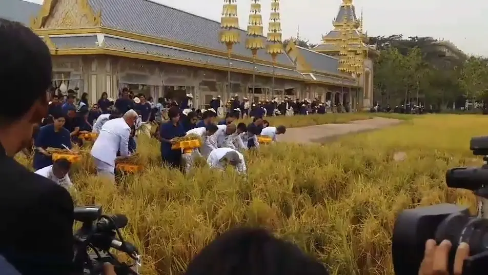 ขณะที่เจ้าหน้าที่กรมการข้าว เตรียมเกี่ยวข้าวในนาข้าวบริเวณสนามหลวงฝั่งทิศเหนือ ก่อนนำไปไว้ที่ศูนย์วิจัยข้าวปทุมธานีเพื่อไว้เป็นพันธุ์ข้าวแจกจ่ายให้กับเกษตรกรและประชาชนคาดว่าข้าวที่จะเกี่ยวได้ทั้งหมดประมาณ 300 กิโลกรัม