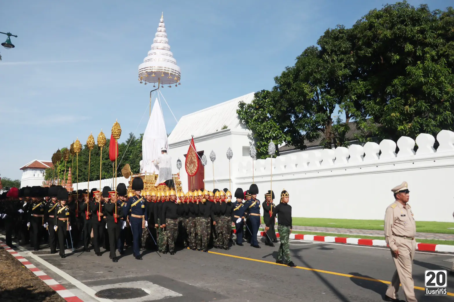 เมื่อริ้วขบวนที่ 1 ถึงหน้าวัดพระเชตุพนวิมลมังคลารามแล้ว สมเด็จพระเจ้าอยู่หัวและสมเด็จพระเทพรัตนราชสุดาฯ เสด็จไปยังพลับพลายกหน้าวัดพระเชตุพนฯ ทรงทอดผ้าไตร 20 ไตร จากนั้นอัญเชิญพระบรมโกศโดยเกรินบันไดนาค ขึ้นประดิษฐานยังพระมหาพิชัยราชรถ แล้วจึงยาตราขบวนแห่อัญเชิญพระบรมโกศไปยังพระเมรุมาศท้องสนามหลวง โดยสมเด็จพระเจ้าอยู่หัว สมเด็จพระเทพรัตนราชสุดาฯ เสด็จตามริ้วขบวนพระบรมราชอิสริยยศ เมื่อขบวนพระบรมราชอิสริยศอัญเชิญพระบรมโกศเข้าสู่ท้องสนามหลวง สมเด็จพระเจ้าอยู่หัว เสด็จไปประทับรอที่พลับพลายก นอกราชวัติพระเมรุมาศ กองทหารเกียรติยศอัญเชิญพระบรมโกศโดยเกรินบันไดนาค ประดิษฐานพระบรมโกศบนราชรถปืนใหญ่ เพื่อตั้งริ้วขบวนพระบรมราชอิสริยยศ สำหรับเวียนพระเมรุมาศ โดยอุตราวัฏ (เวียนซ้าย 3 รอบ) สมเด็จพระเจ้าอยู่หัว เสด็จตามพระบรมโกศเวียนพระเมรุมาศครบ 3 รอบแล้ว สมเด็จพระเจ้อยู่หัวและพระบรมวงศานุวงศ์ เสด็จไปประทับรอที่พระที่นั่งทรงธรรม เทียบราชรถปืนใหญ่ที่เกรินบันไดนาคพระเมรุมาศ อัญเชิญพระบรมโกศขึ้นประดิษฐาน ณ พระจิตกาธาน ปิดฉากพระวิสูตรเป็นอันเสร็จพระราชพิธีอัญเชิญพระบรมโกศประดิษฐานบนพระเมรุมาศ