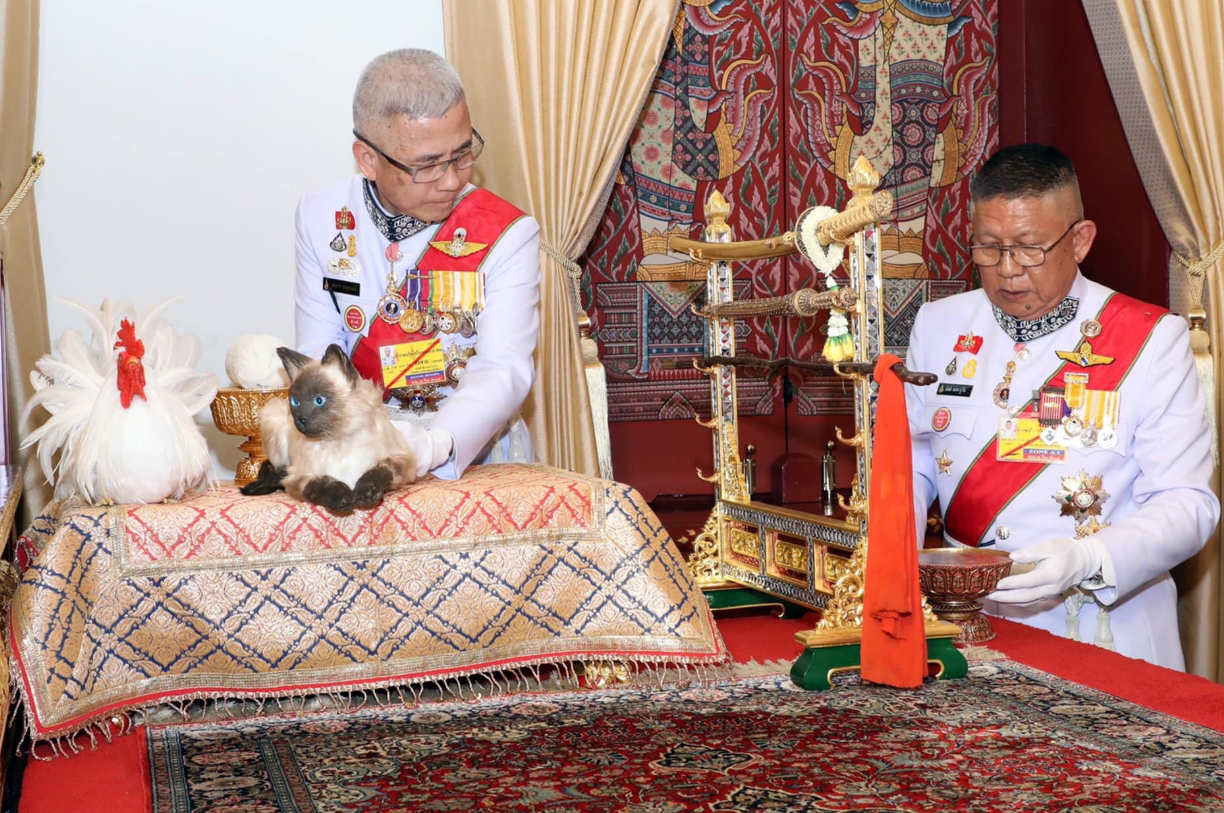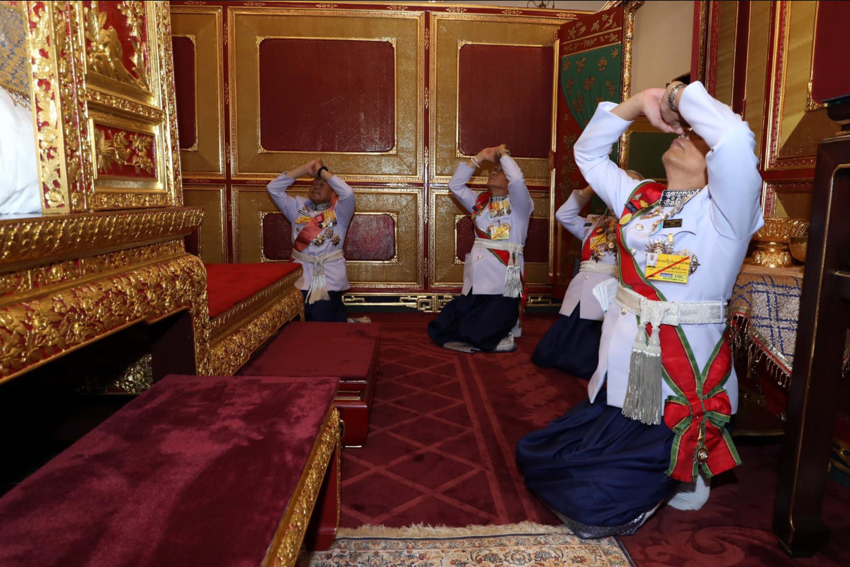 ร้อยโท ฉัตรณรงค์ เรืองพุก เชิญพานพระขันหมากทองคำลงยาองค์ใหญ่เครื่องพร้อม เชิญไปทอดที่บนโต๊ะทองข้างที่ประทับด้านขวา, ร้อยเอก อภิชิต มุกข์โตเกียว เชิญพานพระโอสถไปทอดที่บนโต๊ะทองข้างที่ประทับด้านซ้าย ที่เหลือผู้เชิญนำไปมอบให้ พันโท สมชาย กาญจนมณี ที่พระที่นั่งองค์ตะวันออก เสร็จแล้วกลับมา เฝ้าฯ ที่ท้องพระโรงกลาง พันโท สมชาย กาญจนมณี นำพระแสงไปทอดที่บันไดแก้ว รับเครื่องทั้งหมดไปทอดไว้ที่โต๊ะบนชั้นลด รับแมวและไก่ขาว ให้เจ้าพนักงานอุ้มเชิญไว้ ผู้เชิญเทียนส่งเทียนให้เจ้าพนักงานแล้วไปรวมเฝ้าฯ ที่ท้องพระโรงกลาง