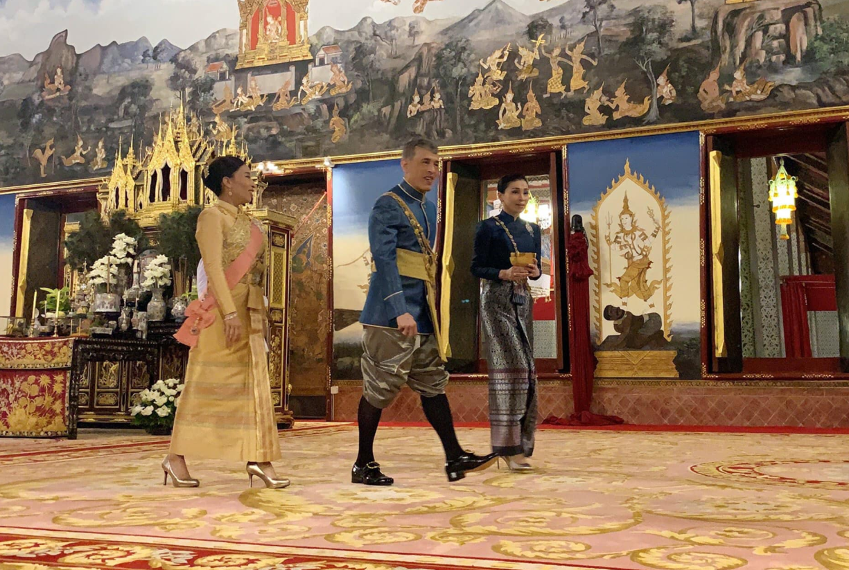 เมื่อเสด็จเข้าท้องพระโรงหน้าขึ้นพระที่นั่งจักรพรรดิพิมานทางอัฒจันทร์ตะวันตก โดยขบวนตามขึ้นไปบนท้องพระโรงกลาง พระบาทสมเด็จพระเจ้าอยู่หัว และสมเด็จพระนางเจ้าฯ พระบรมราชินี ประทับพระราชอาสน์ ท้องพระโรงกลาง พันโท สมชาย กาญจนมณี วางขันทองคำพร้อมพานรองที่โต๊ะบนพระแท่นลด, พันตำรวจเอก ธรรมนิธิ วณิชย์ถนอม เชิญพระแสงดาบคาบค่าย เฝ้า ฯ อยู่ข้างที่ประทับ, ร้อยโท ธนิสร งามพริ้ง เชิญพระสุพรรณศรีบัวแฉก เชิญไปทอดที่บนโต๊ะทองข้างที่ประทับด้านขวา