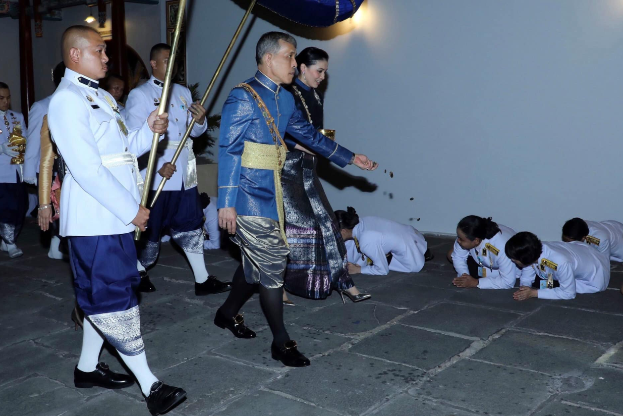 ต่อมาเวลา 20.00 น. พระบาทสมเด็จพระเจ้าอยู่หัว ทรงเครื่องฉลองพระองค์เฉลิมราชมณเฑียร ทรงพระสังวาลนพรัตน์ราชวราภรณ์ พระสังวาลพระนพ พร้อมด้วย สมเด็จพระนางเจ้าฯ พระบรมราชินี เสด็จออกจากพระที่นั่งจักรพรรดิพิมานไปยังพระที่นั่งไพศาลทักษิณ เข้าริ้วขบวนตามผู้นำเทียน พันโท สมชาย กาญจนมณี ถวายขันทองคำพร้อมพานรอง ทรงโปรยเหรียญกษาปณ์ หมุนเวียน รัชกาลที่ 10 ชนิดราคา 2 บาท พระราชทานตลอดเส้นทางขบวนเสด็จ