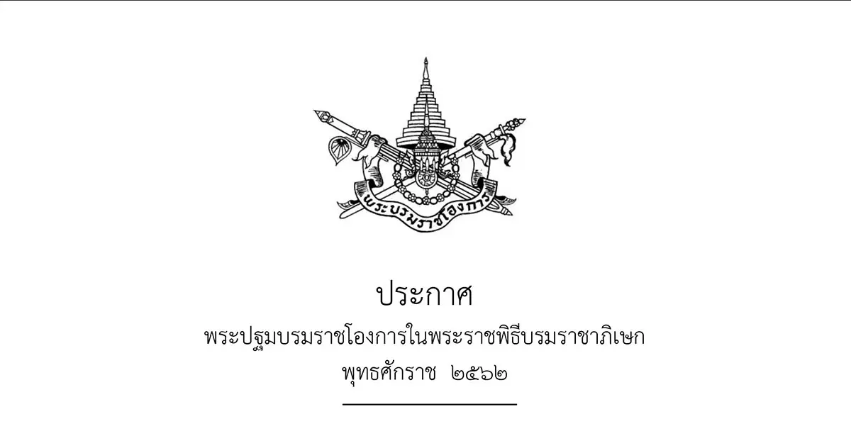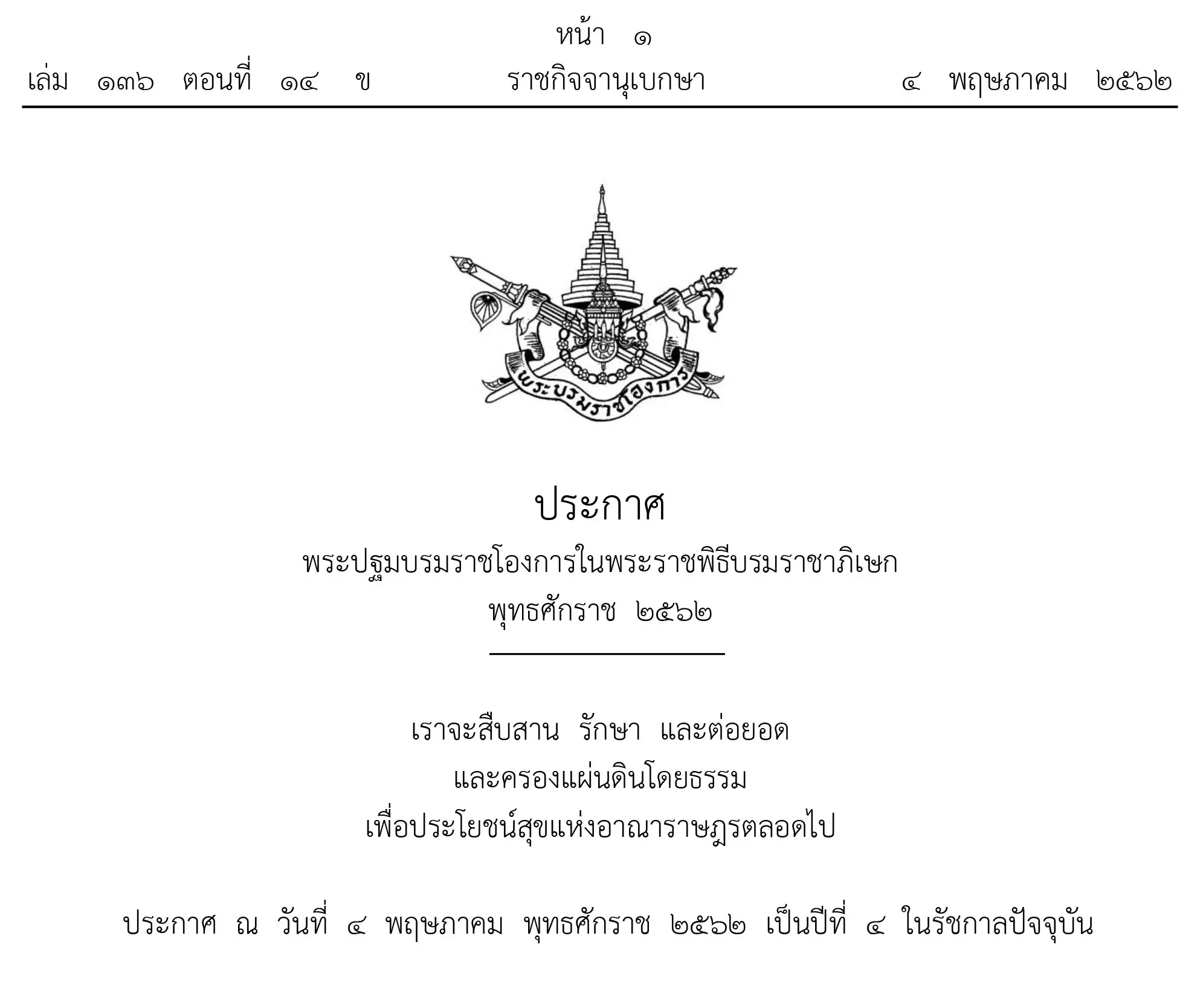 ประกาศ  ณ  วันที่  ๔  พฤษภาคม  พุทธศักราช  ๒๕๖๒  เป็นปีที่  ๔  ในรัชกาลปัจจุบัน