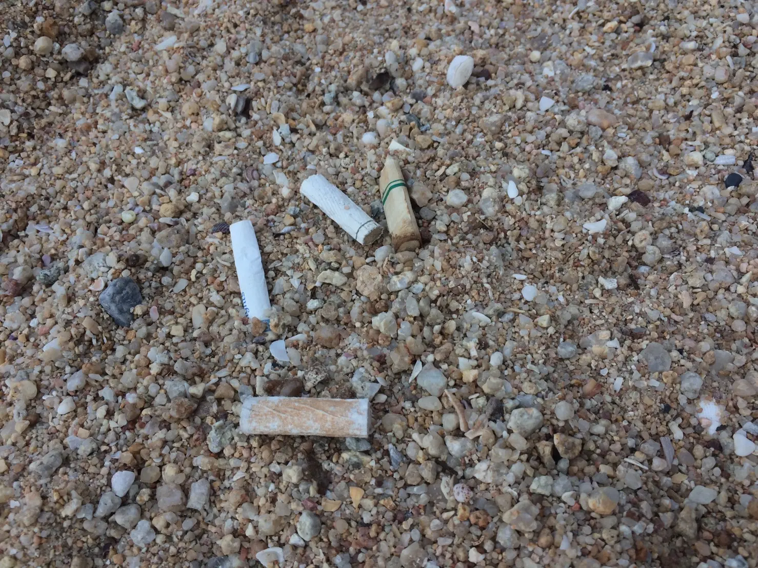 ก้นบุหรีที่ถูกน้ำพัดพาลงคูคลอง จนลงสู่ทะเล สะสมอยู่ใต้พื้นทรายตามชายหาด ก่อให้เกิดผลต่อสิ่งมีชีวิต และระบบนิเวศ โดยเมื่อสัมผัสกับน้ำจะปล่อยสารเคมีที่เป็นพิษ เช่น แคดเมี่ยม ตะกั่ว สารหนู และอนุพันธุ์ของยาฆ่าแมลง ซึ่งเป็นพิษต่อห่วงโซ่อาหาร