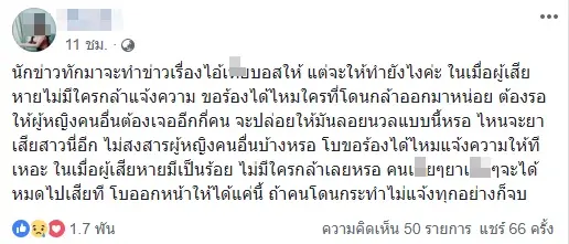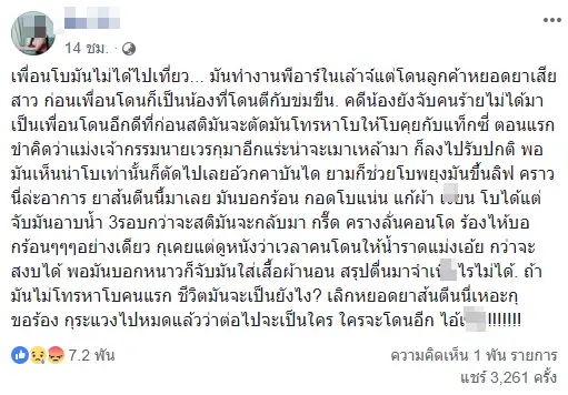 ภาพจากเฟซบุ๊กชื่อ Bo Zii เผยสภาพเพื่อนของเธอกำลังอยู่ในภาวะ “เมายาเสียวสาว” โดยมีอาการร้อนจนต้องแก้ผ้า อาเจียน และไม่มีสติ ระบุข้อความว่า “จากที่กุตลก มันไม่ตลกแล้ว เมื่อวานน้องวันนี้เพื่อนรักกุ? จะหยอดยากันทำเxี้ยอะไร สงสารผญไหม ถ้ามันไม่โทรหากุคนแรกจะเกิดอะไรขึ้น ร้องร้อน จะแก้ผ้า อ้วก กอดขาไม่ได้สติไม่รู้ด้วยว่าอยู่ไหน ไอ้XXอย่าให้กูรู้ว่าใครทำ ไม่ต้องนอนมันแล้วไอ้XXX!!!!!!”