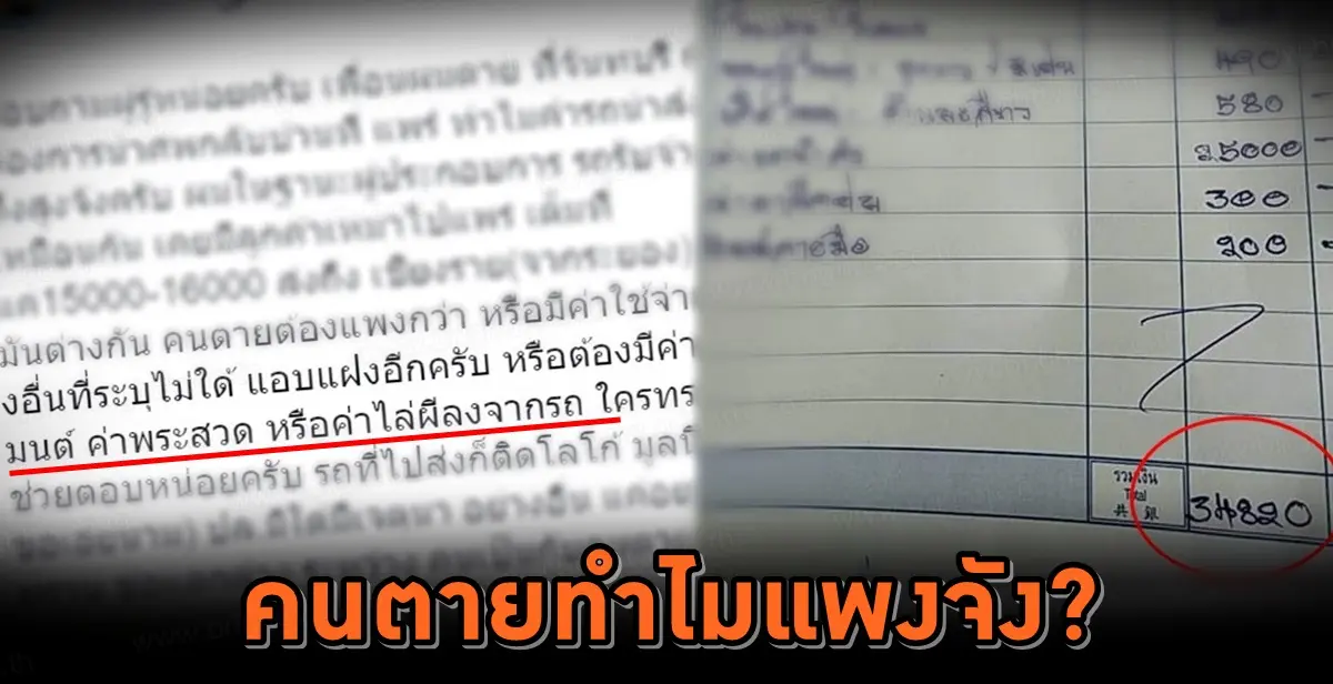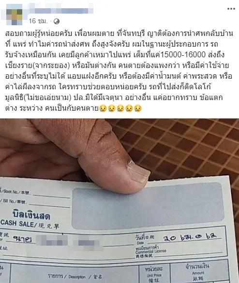 21 เม.ย. 62 ข้อความจากผู้ใช้เฟซบุ๊กชื่อ Chook Kaweepol โพสต์บิลค่าบริการรถส่งศพที่มีค่าใช้จ่ายกว่า 3 หมื่นบาท ถามชาวเน็ตแบบนี้เหมาะสมไหม ระบุว่า “สอบถามผู้รู้หน่อยครับ เพื่อนผมตาย ที่จันทบุรี ญาติต้องการนำศพกลับบ้านที่ แพร่ ทำไมค่ารถนำส่งศพ ถึงสูงจังครับ ผมในฐานะผู้ประกอบการ รถรับจ้างเหมือนกัน เคยมีลูกค้าเหมาไปแพร่ เต็มที่แค่15000-16000 ส่งถึง เชียงราย(จากระยอง) หรือมันต่างกัน คนตายต้องแพงกว่า หรือมีค่าใช้จ่ายอย่างอื่นที่ระบุไม่ใด้ แอบแฝงอีกครับ หรือต้องมีค่าน้ำมนต์ ค่าพระสวด หรือค่าไล่ผีลงจากรถ ใครทราบช่วยตอบหน่อยครับ รถที่ไปส่งก็ติดโลโก้ มูลนิธิ(ไม่ขอเอ่ยนาม) ปล.มิใด้มีเจตุนา อย่างอื่น แค่อยากทราบ ข้อแตกต่าง ระหว่าง คนเป็นกับคนตาย”