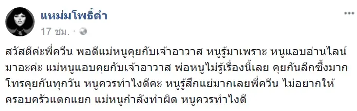 เมื่อวันที่ 31 ต.ค. 60 เฟซบุ๊กแฟนเพจ แหม่มโพธิ์ดำ โพสต์ข้อความจากแชทไลน์หลุดระหว่างหญิงกับพระสงฆ์ระบุว่า “สวัสดีค่ะพี่ควีน พอดีแม่หนูคุยกับเจ้าอาวาส หนูรู้มาเพราะ หนูแอบอ่านไลน์มาอะค่ะ แม่หนูแอบคุยกับเจ้าอาวาส พ่อหนูไม่รู้เรื่องนี้เลย คุยกันลึกซึ้งมาก โทรคุยกันทุกวัน หนูควรทำไงดีคะ หนูรู้สึกแย่มากเลยพี่ควีน ไม่อยากให้ครอบครัวแตกแยก แม่หนูกำลังทำผิด หนูควรทำไงดี”