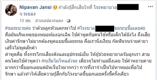 ภาพเด็กชายหัวแตกมีคราบเลือดติดเสื้อพร้อมข้อความจากคุณแม่สุดทนพฤติกรรมหมอในโรงพยาบาลแห่งหนึ่งใน จ.ระยอง ระบุว่า “#ขอระบายค่ะ​ ว่าด้วยลูกหัวแตกพาไป​ #โรงบาลXXXขอระบุชื่อเลยค่ะ​ คือมันเกินเหตุของหมอห้องฉุกเฉิน​ ใช้คำพูดกับคนไข้หรือเด็กได้ยังไ​ง​ ถึงเสียเงินค่ารักษา​ไม่มากต้องพูดแบบนี้เลยหรอ คือเรานั่งเงียบ​ กัดฟันจนจ่ายค่ายาเสร็จ​ไม่พูดสักคำ​ คำพูดคือ​ ทิ้งกรรไกร​เสียงดัง​และอุปกรณ์​เย็บ​ ให้ผู้ช่วยพยายาลจับลูกเรา​ สามคนโดยใช้คำพูดว่า​ #กุเริ่มโมโหแล้วนะ​ เดียวกุไม่ทำแม่มึงเลย​ ใช้คำหยาบคายมากกว่านี้บอกเลยแต่มันเจ็บใจมากกว่า​ การที่เราจำเป็นไปหาหมอเพื่อไปรักษา​ แล้วทำให้เสียความรู้สึก​กับโรงบาลนี้บอกเลยครั้งนี้ครั้งเดียว​”