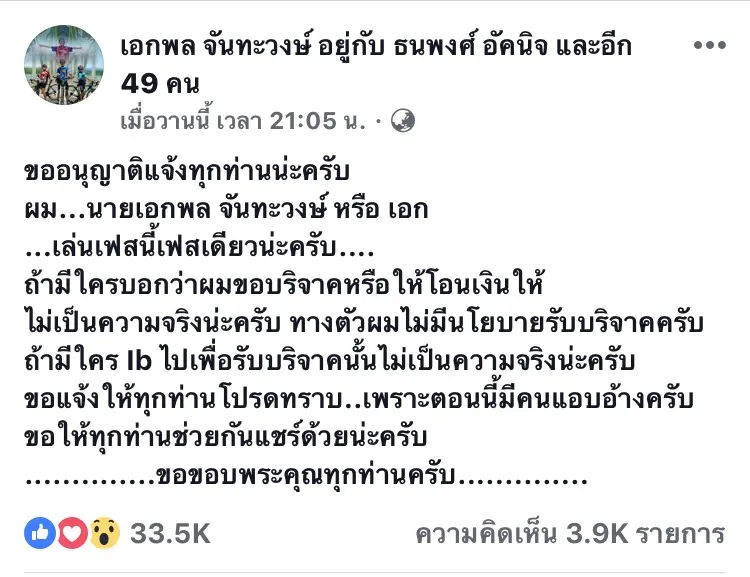 “โค้ชเอก” ชี้แจงเล่นเฟซบุ๊กเดียว!! เตือนภัยคนที่ติดตามอย่าได้ไปหลงกลโอนเงินให้มิจฉาชีพ เผยตนเองไม่มีนโยบายในการขอรับบริจาคใดๆทั้งสิ้น