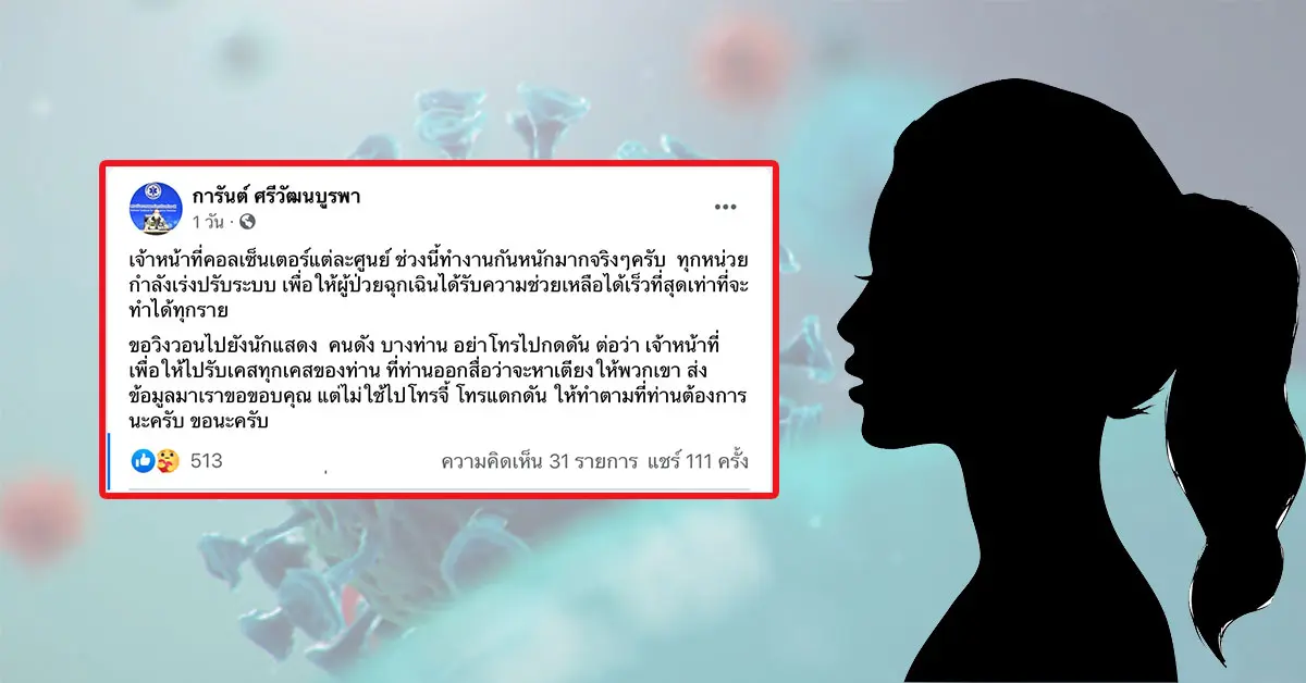 เจ้าหน้าที่คอลเซ็นเตอร์แต่ละศูนย์ ช่วงนี้ทำงานกันหนักมากจริงๆครับ ทุกหน่วยกำลังเร่งปรับระบบ เพื่อให้ผู้ป่วยฉุกเฉินได้รับความช่วยเหลือได้เร็วที่สุดเท่าที่จะทำได้ทุกรายขอวิงวอนไปยังนักแสดง คนดัง บางท่าน อย่าโทรไปกดดัน ต่อว่า เจ้าหน้าที่ เพื่อให้ไปรับเคสทุกเคสของท่าน ที่ท่านออกสื่อว่าจะหาเตียงให้พวกเขา ส่งข้อมูลมาเราขอขอบคุณ แต่ไม่ใช้ไปโทรจี้ โทรแดกดัน ให้ทำตามที่ท่านต้องการ นะครับ ขอนะครับ