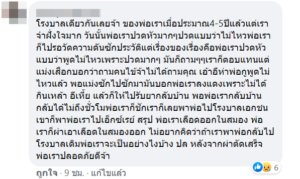 จนกูต้องเดินลงไปบอกว่าจะไม่เอารถเข็นอะไรมารับคนไข้หรอ? พวกนางก็เงียบๆแล้วก็เอารถเข็นมาวางไว้ข้างรถแล้วที่เหลือเราต้องช่วยตัวเองทุกอย่าง โอเคเสร็จกูก็ขับรถออกไปหาที่จอดรถใช่มั้ย พอได้ที่จอดรถเดินกลับมา ก็เห็นแม่ยังนั่งท้องบิดอยู่ที่เดิม