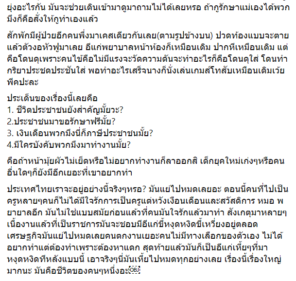 ณ ตอนนั้น คนไข้ในห้องมีทั้งหมด 2 คน ก็ไม่ได้ดูยุ่งอะไรกัน มันจะช่วยเดินเข้ามาดูมาถามไม่ได้เลยหรอ ถ้ากูรักษาแม่เองได้พวกมึงก็คือสั่งให้กูทำเองแล้ว