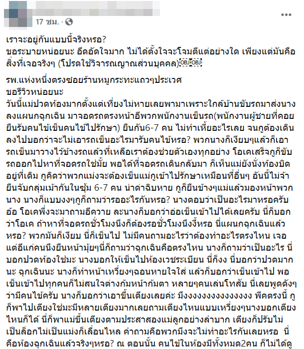 เมื่อวันที่ 12 พฤษภาคมที่ผ่านมา ได้มีผู้ใช้เฟซบุ๊กรายหนึ่ง โพสต์ภาพและข้อความ หลังจากที่พาคุณแม่ที่ปวดท้องอย่างหนักไปห้องฉุกเฉินของโรงพยาบาลแห่งหนึ่งแถวประเวศ โดยเจ้าตัวได้โพสต์ข้อความเกี่ยวกับสิ่งที่พบเจอว่า