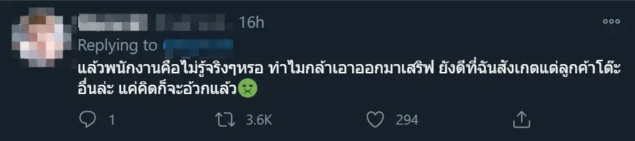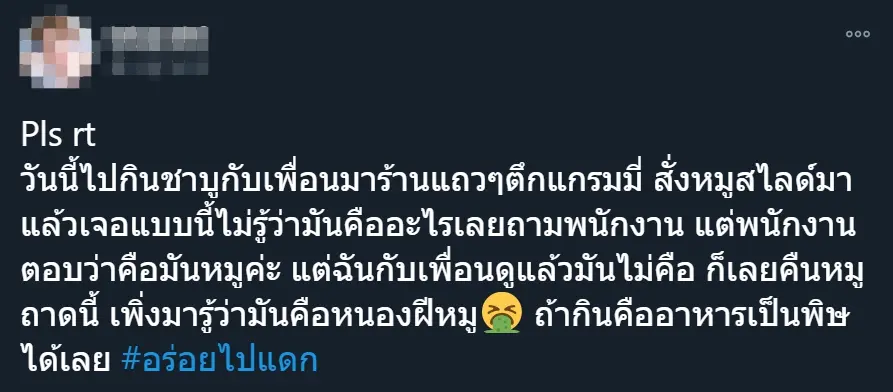 “แต่พนักงานตอบว่าคือมันหมูค่ะ แต่ฉันกับเพื่อนดูแล้วมันไม่คือ ก็เลยคืนหมูถาดนี้ เพิ่งมารู้ว่ามันคือหนองฝีหมู ถ้ากินคืออาหารเป็นพิษได้เลย แล้วพนักงานคือไม่รู้จริงๆหรอ ทำไมกล้าเอาออกมาเสริฟ ยังดีที่ฉันสังเกตแต่ลูกค้าโต๊ะอื่นล่ะ แค่คิดก็จะอ้วกแล้ว”