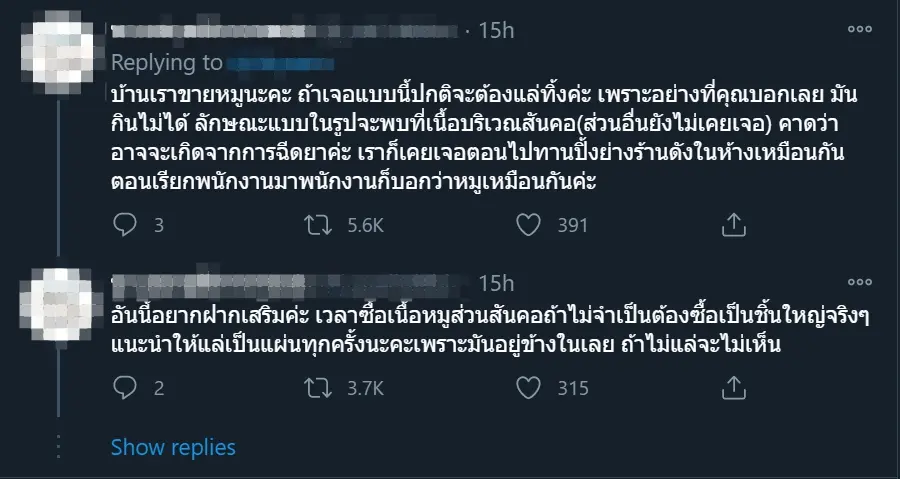 ขณะเดียวกัน ได้มีโพสต์จากผู้ใช้ทวิตเตอร์รายหนึ่ง ได้โพสต์ถึงกรณีดังกล่าว เคยเจอเหตุการณ์เดียวกัน ระบุว่า “บ้านเราขายหมูนะคะ ถ้าเจอแบบนี้ปกติจะต้องแล่ทิ้งค่ะ เพราะอย่างที่คุณบอกเลย มันกินไม่ได้ ลักษณะแบบในรูปจะพบที่เนื้อบริเวณสันคอ(ส่วนอื่นยังไม่เคยเจอ) คาดว่าอาจจะเกิดจากการฉีดยาค่ะ เราก็เคยเจอตอนไปทานปิ้งย่างร้านดังในห้างเหมือนกัน ตอนเรียกพนักงานมาพนักงานก็บอกว่าหมูเหมือนกันค่ะ”