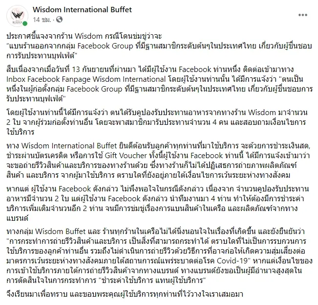 กลายเป็นประเด็นดราม่าร้อนบนโลกออนไลน์เมื่อกลางดึกที่ผ่านมา หลังจากที่เฟซบุ๊กเพจ Wisdom International Buffet ร้านอาหารบุฟเฟต์ชื่อดังได้ออกมาโพสต์ข้อความชี้แจง หลังจากที่มีผู้ใช้เฟซบุ๊กรายหนึ่ง อินบ็อกซ์เ้ขาไปยังเฟซบุ๊กเพจของทางร้านพร้อมกับแจ้งว่า “ตนเป็นหนึ่งในผู้ก่อตั้งกลุ่ม Facebook Group ที่มีฐานสมาชิกระดับต้นๆในประเทศไทย เกี่ยวกับผู้ชื่นชอบการรับประทานบุฟเฟ่ต์”