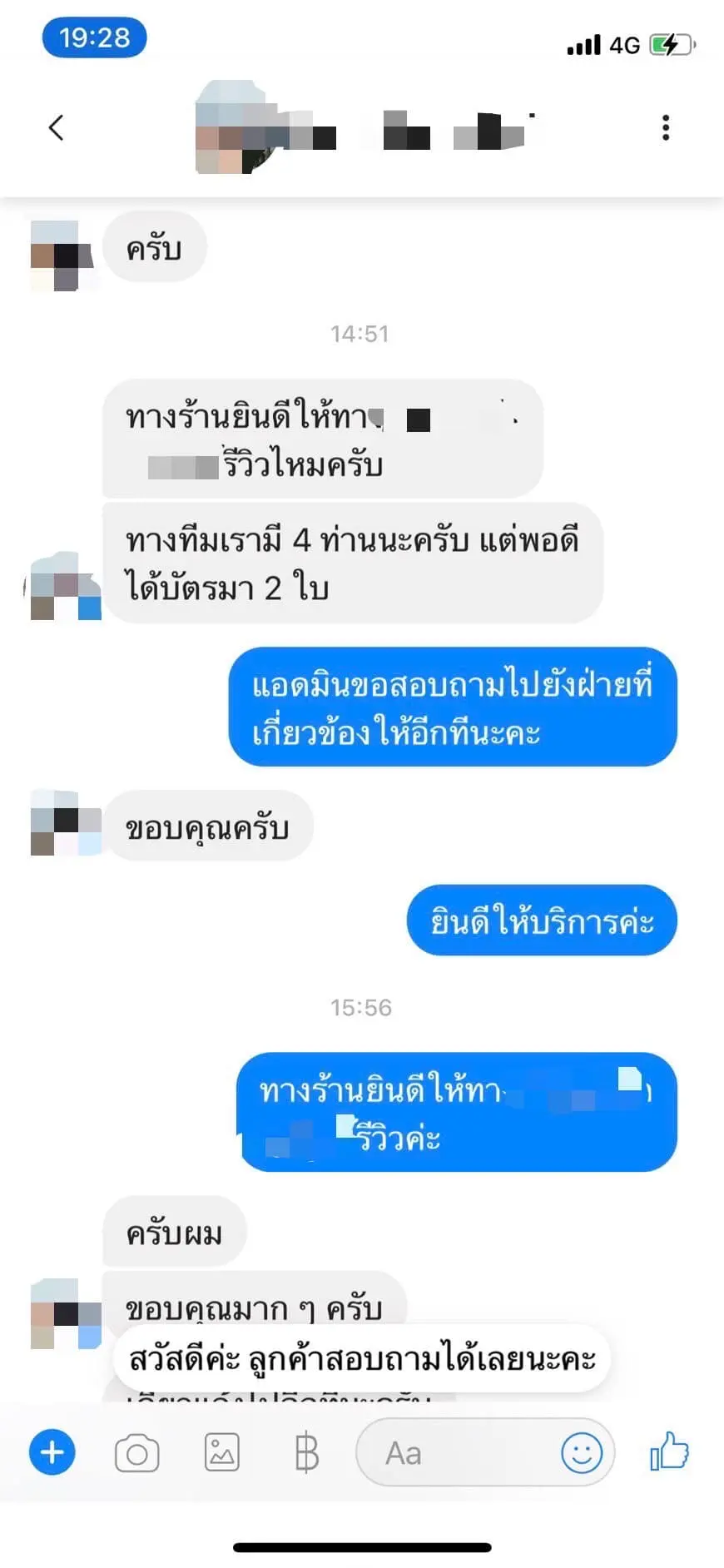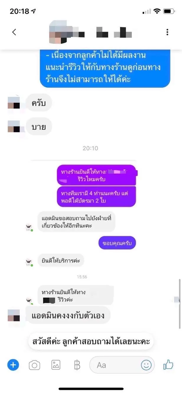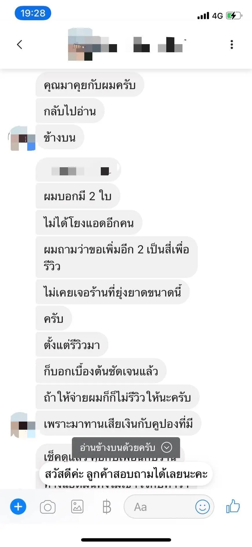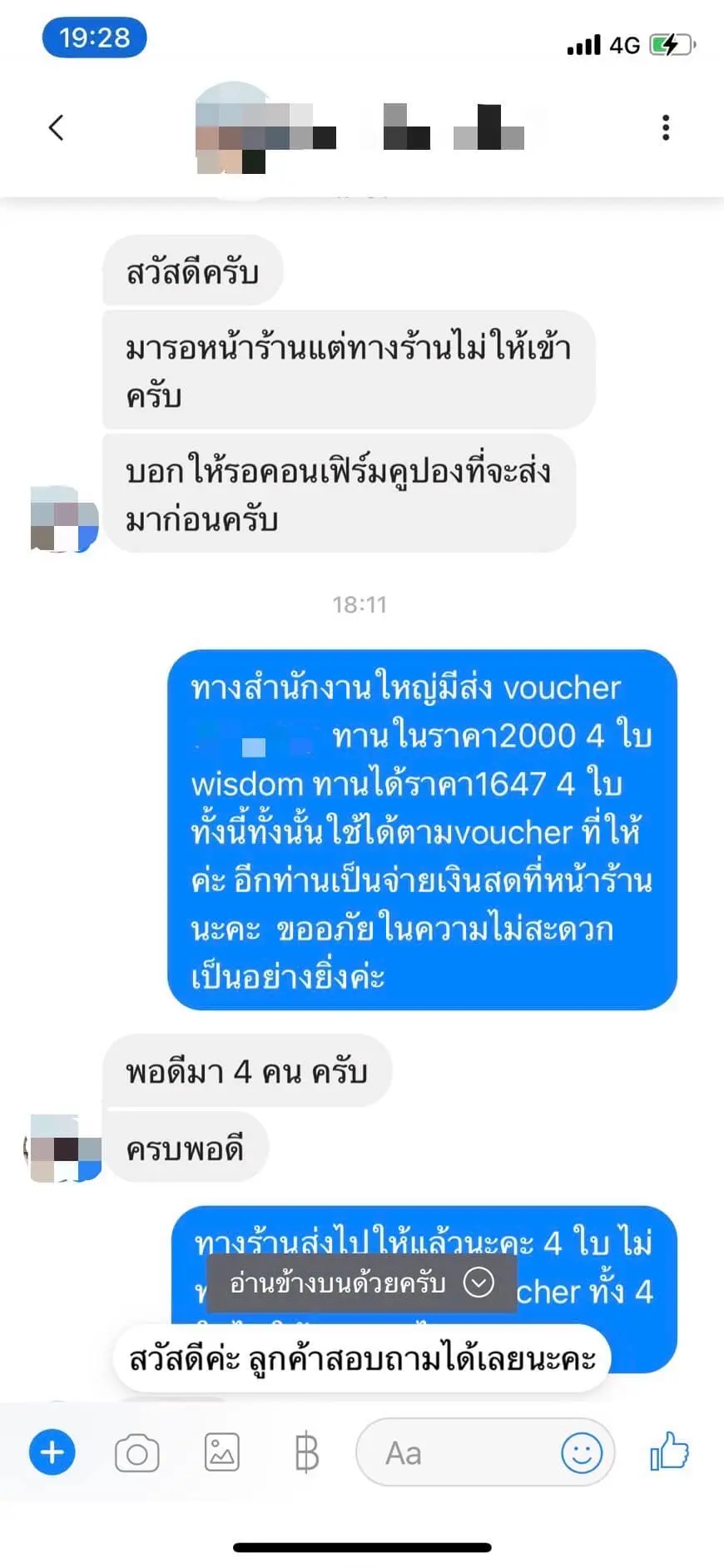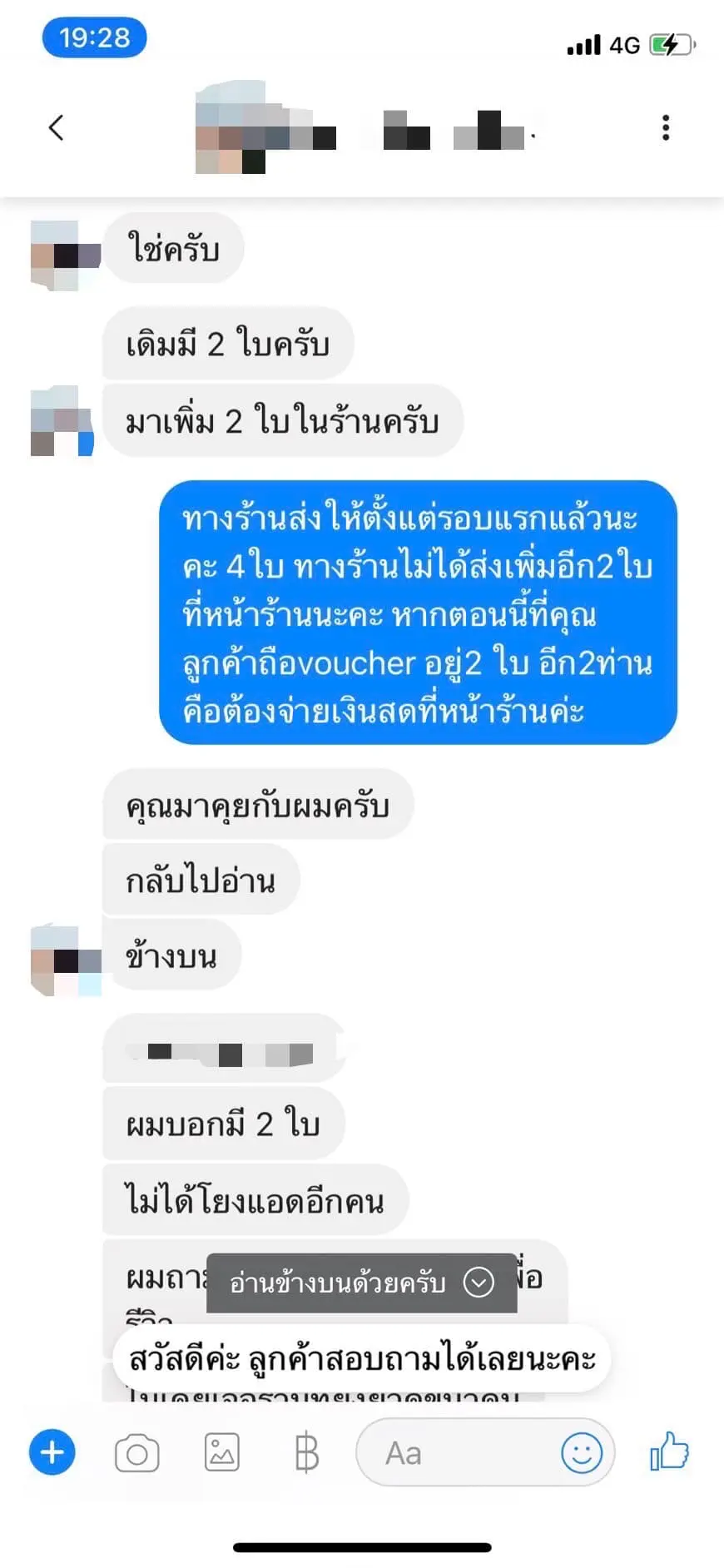 อีกทั้งทางร้านได้พูดคุยผ่า่นอินบ็อกซ์กับผู้ใช้งานรายนี้แล้วว่า สำนักงานใหญ่ได้ส่งคูปองให้กับกลุ่มแอดมินไปแล้ว 8 ใบ คือ วอชเชอร์ทานในราคา 2,000 บาท 4 ใบ และทานได้ในราคา 1,647 บาท 4 ใบ พร้อมทั้งยังได้ระบุว่า สามารถใช้ได้ตามวอชเชอร์ที่ให้ไป สำหรับอีกท่านจ่ายเป็นเงินสิดที่หน้าร้าน