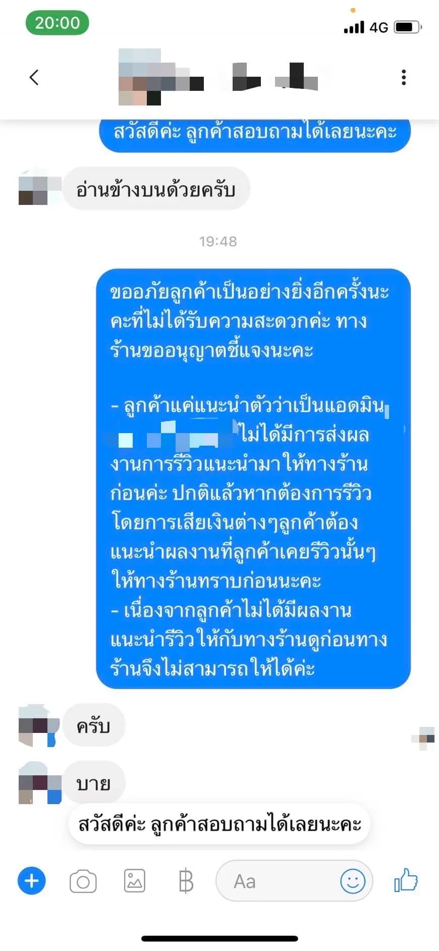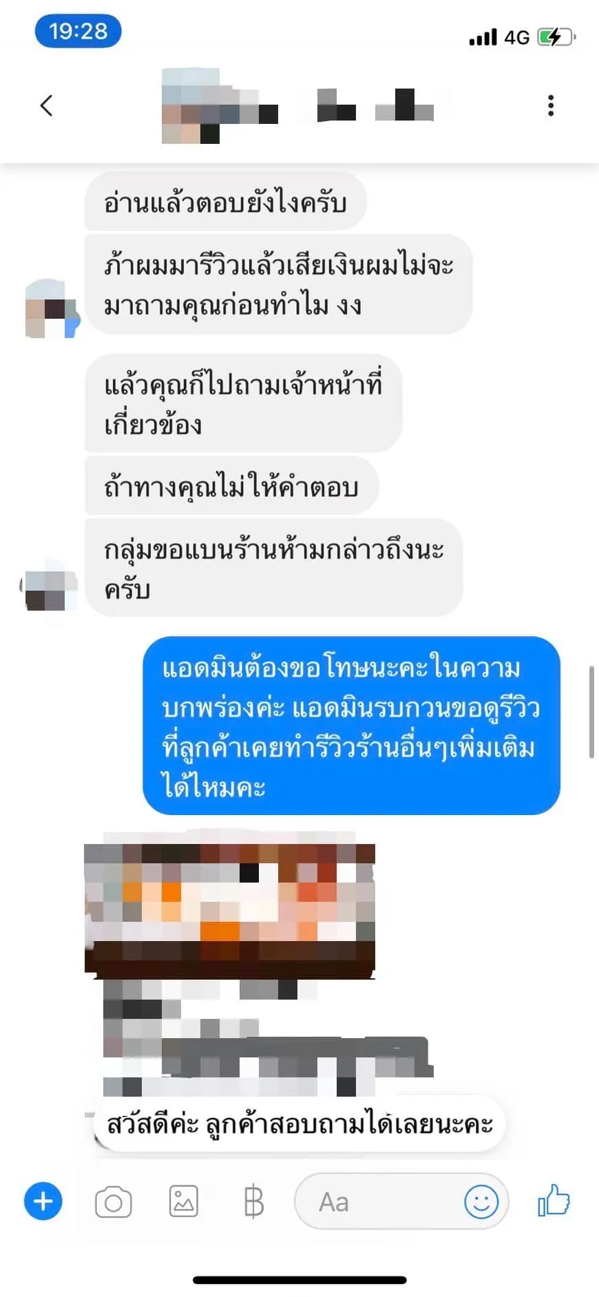 ทางด้านของผู้ใช้เฟซบุ๊ก ยังได้ตำหนิทางร้านอีกว่า “ถ้าให้จ่ายผมก็ไม่รีวิวให้นะครับ เพราะมากินเสียเงิน เช็กดูแล้ว คุยกับทางร้าน และร้านคงไม่เข้าใจคำว่ารีวิว รีวิวคือ การมากินแล้วคนกินไม่เสียเงิน แล้วเราไปทำโฆษณาให้ บางร้านนี่คือนอกจากจะได้กินฟรีแล้วยังเสียเงินให้คนรีวิวอีก ไม่ประทับใจทั้งร้าน ไม่ประทับใจทั้งแอดมินเฟซบุ๊กร้าน แล้วให้คุณไปถามเจ้าหน้าที่ที่เกี่ยวข้อง ถ้าคุณไม่ให้คำตอบ กลุ่มขอแบนร้านนี้และห้ามกล่าวถึงนะครับ”